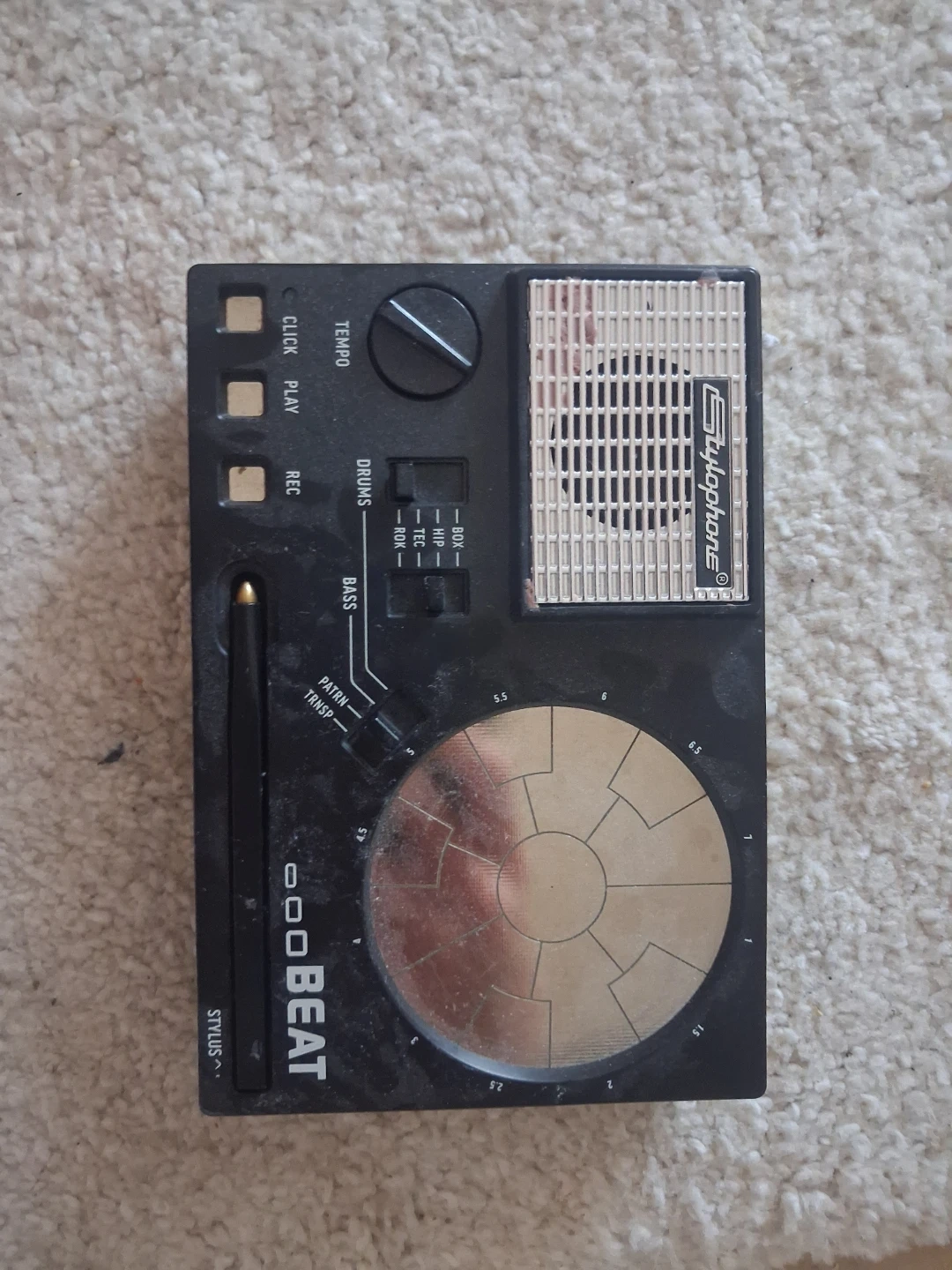This is a Stylophone Beat electronic music toy. It has controls for tempo, drums, and bass patterns. It includes a built-in speaker and a stylus for playing. It runs on AA batteries. the battery compartment cover is missing