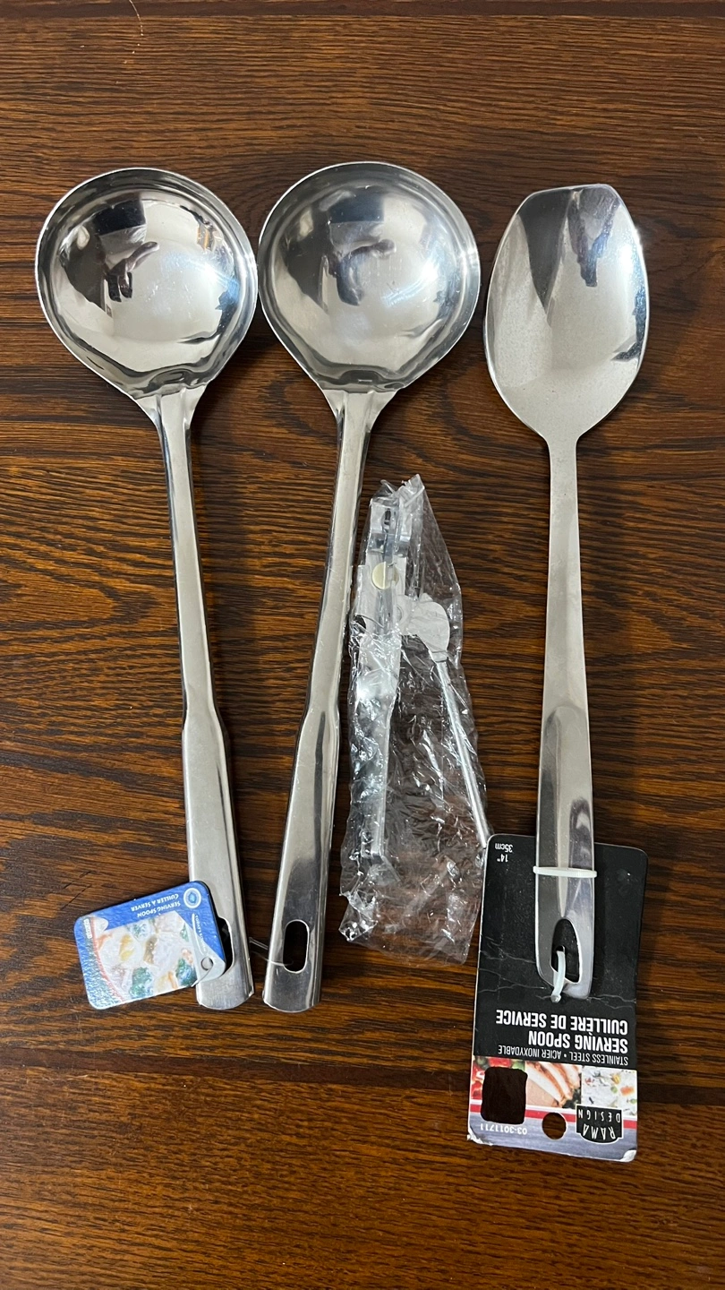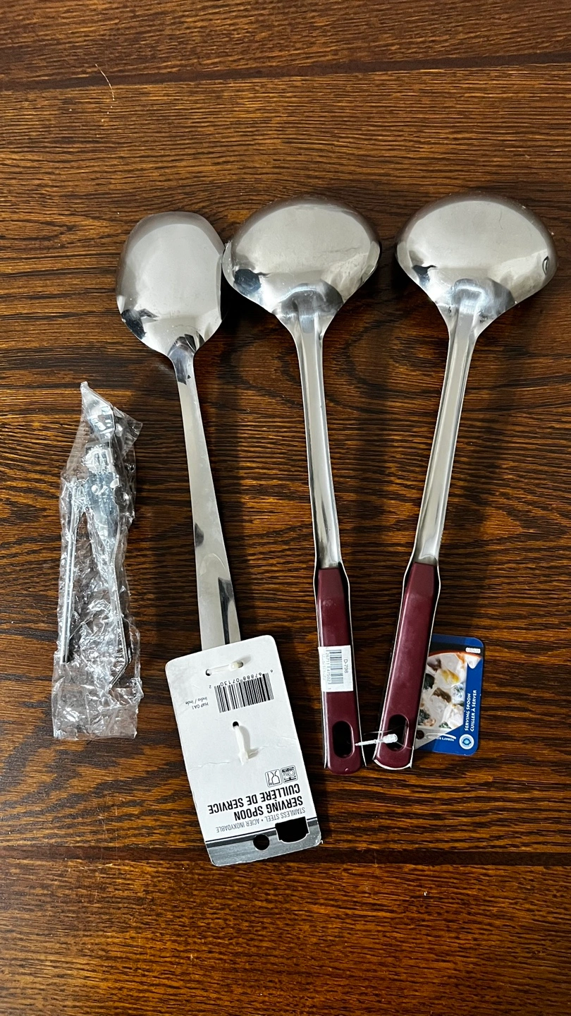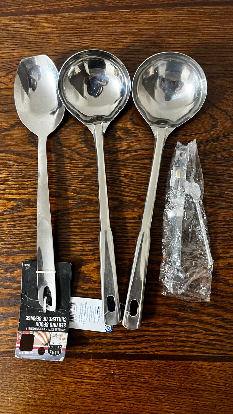 There are two ladles ; 1 can opener and one serving spoon. They are all stainless steel and ready for a new home