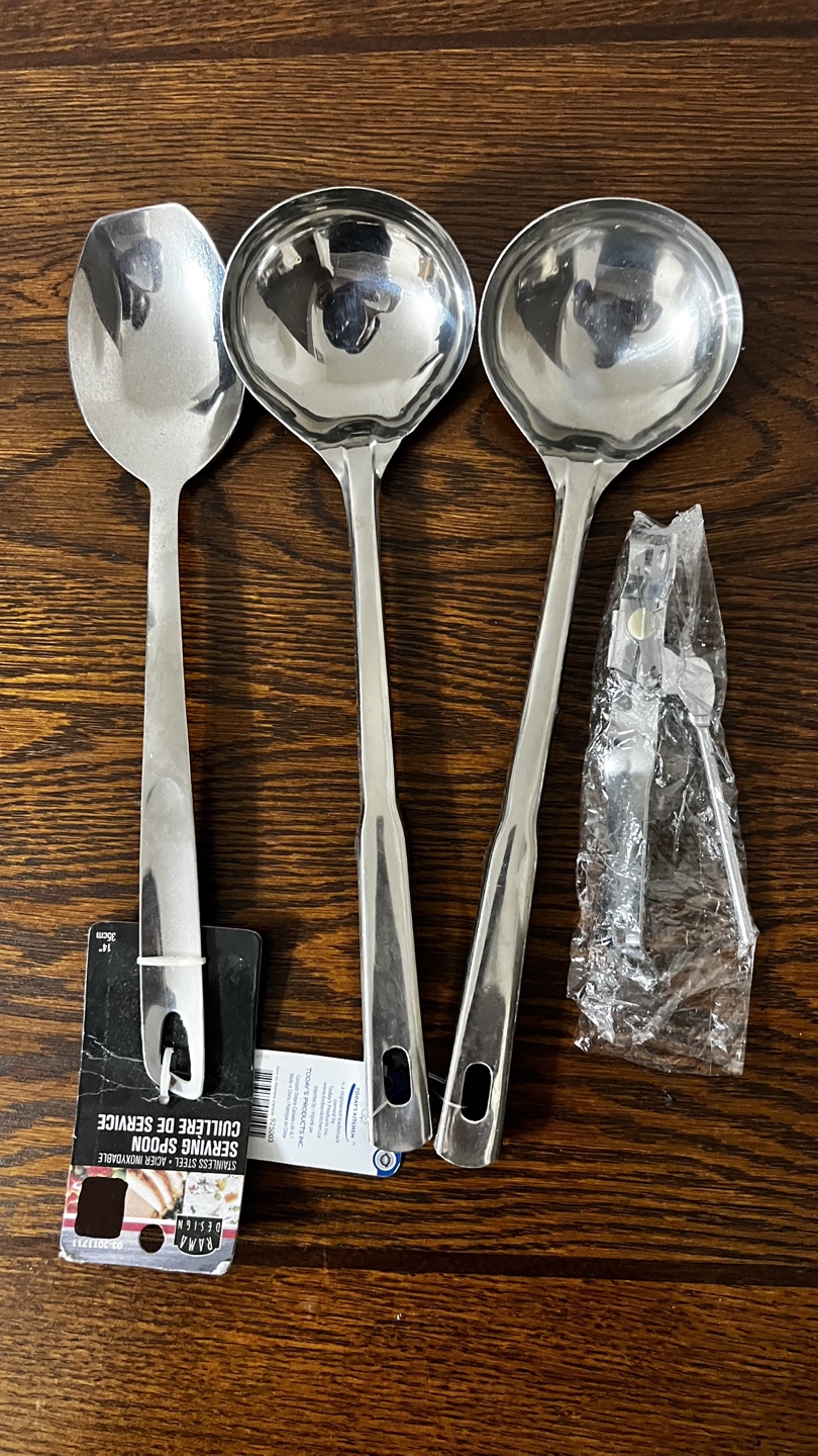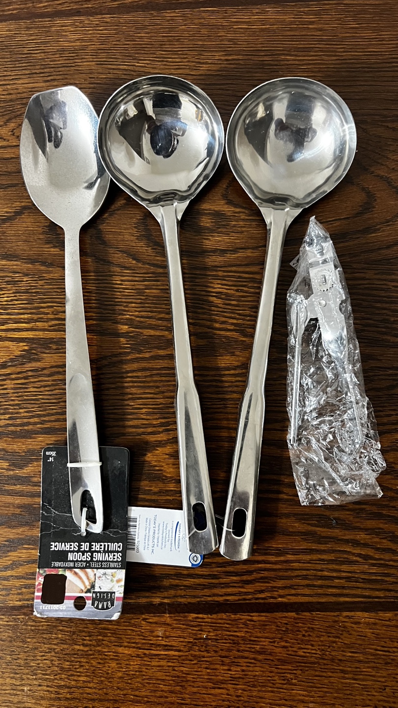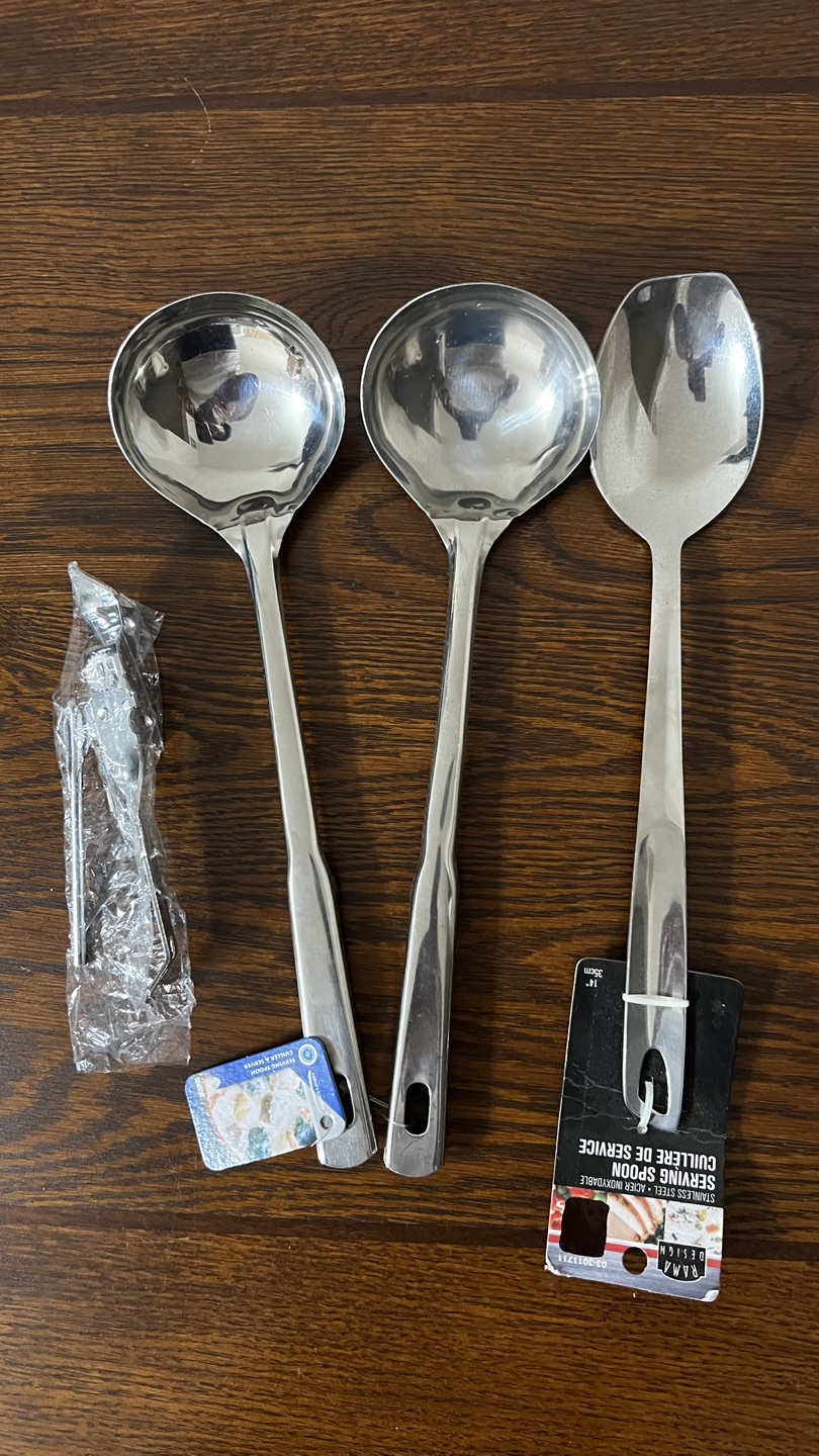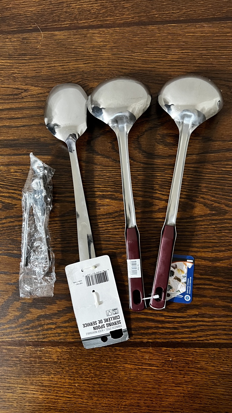 There are two ladles ; 1 can opener and one serving spoon. They are all stainless steel and ready for a new home