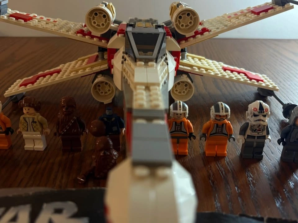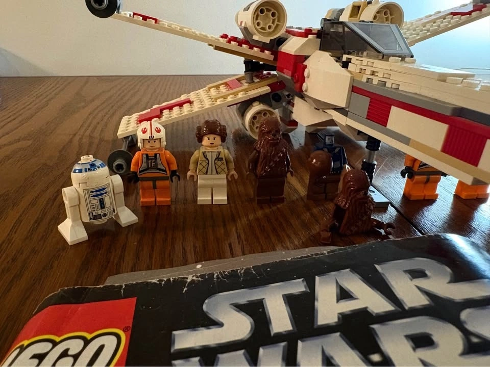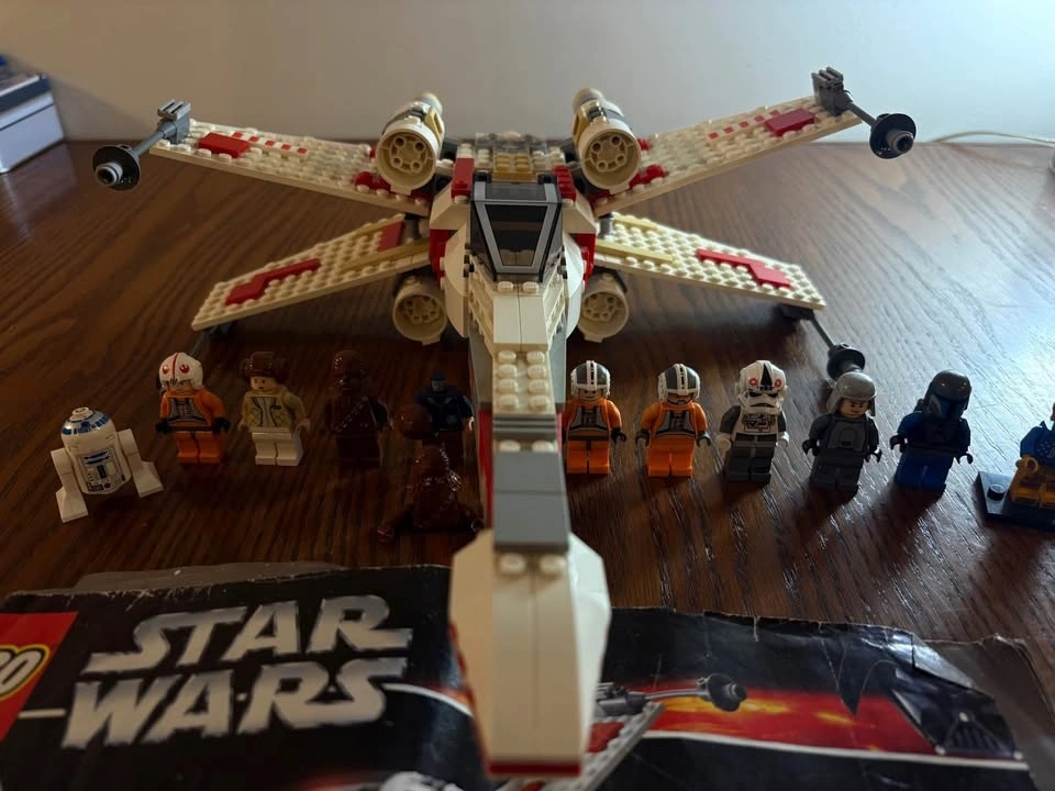 Selling LEGO Star Wars Set 6212 X-Wing Fighter (2006 edition). Set is approximately 90–95% complete. Fully built and functional with all major components intact. May be missing a small number of minor pieces (estimated 0–10). Includes original instruction manual (worn but complete). Minifigures included: Luke Skywalker (pilot), Princess Leia, Chewbacca, R2-D2, Han Solo (missing head). Also includes additional minifigures such as C-3PO, extra R2 unit, rebel pilots, and a bonus Indiana Jones figure. Overall good condition. Some light cosmetic wear consistent with age. R2-D2 has minor scratches. Great display piece or collector set from the pre-Disney LEGO Star Wars era. Pickup only. Let me know if you're interested!