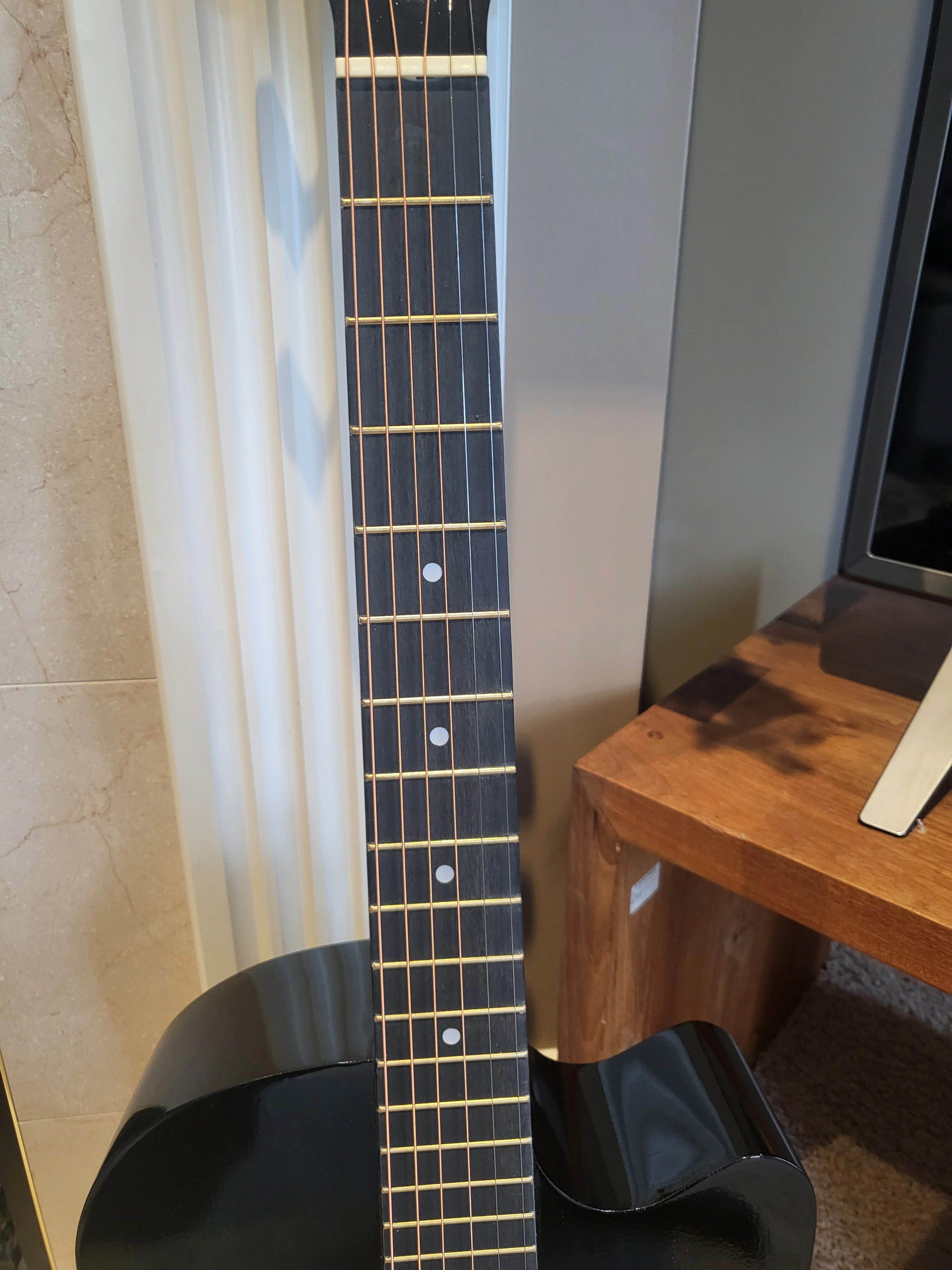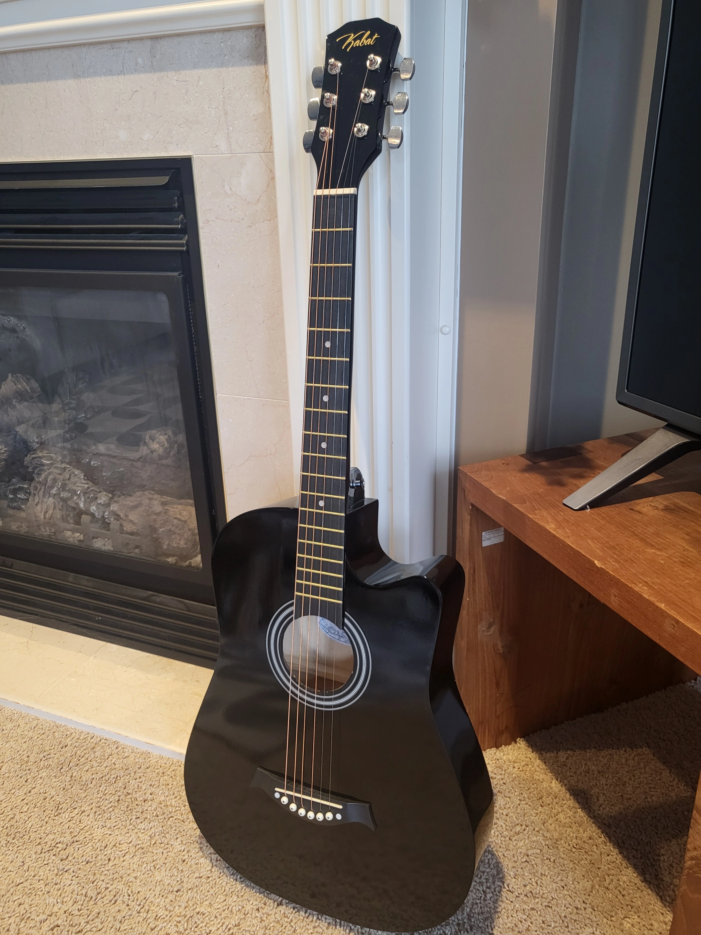 38-inch black acoustic guitar in excellent condition, perfect for beginners or casual players.