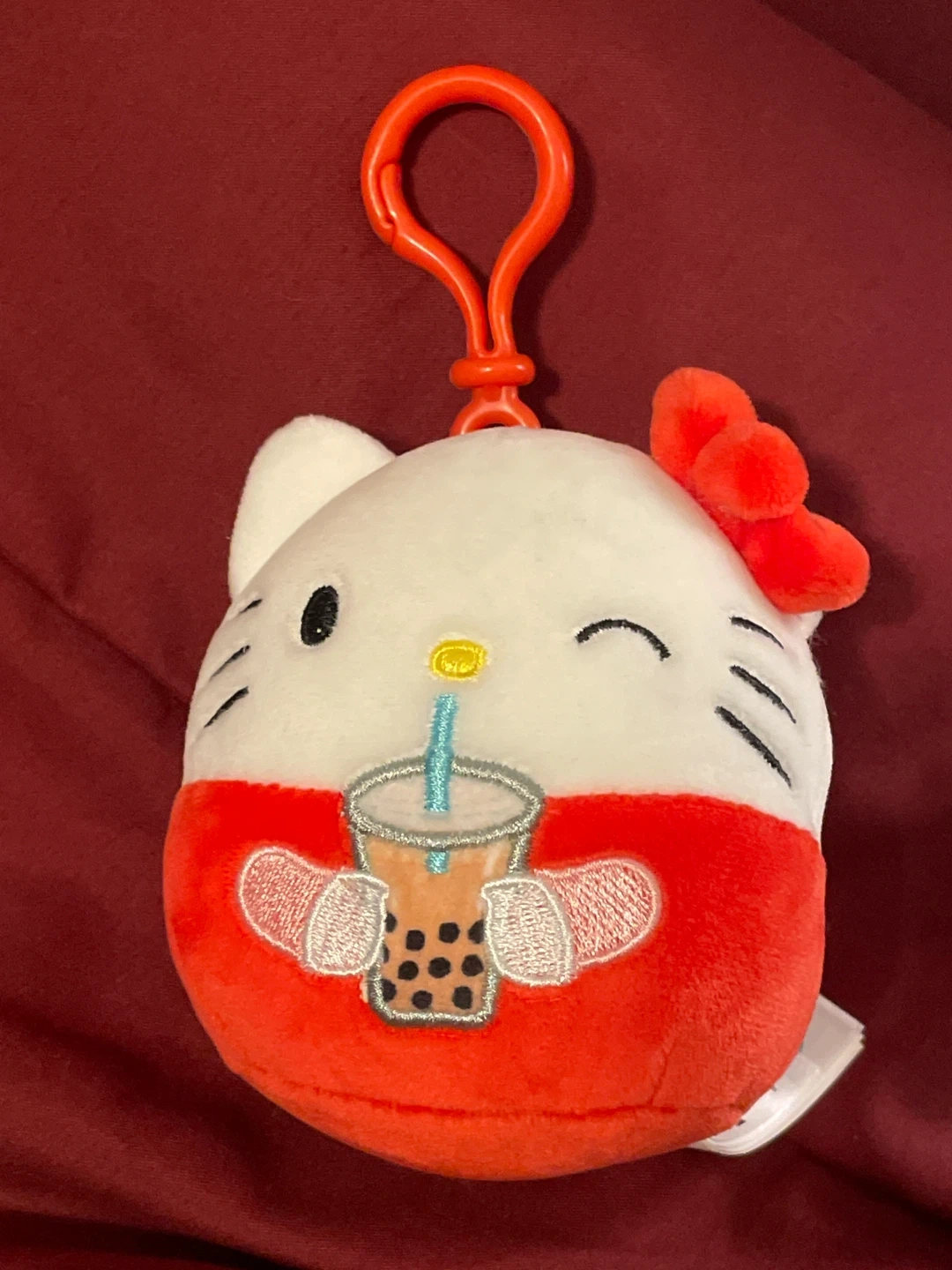 This is a cute Hello Kitty plush keychain clip. It's designed to look like Hello Kitty holding a boba tea cup. It has a bright orange and white colour scheme. Perfect for attaching to bags or backpacks!