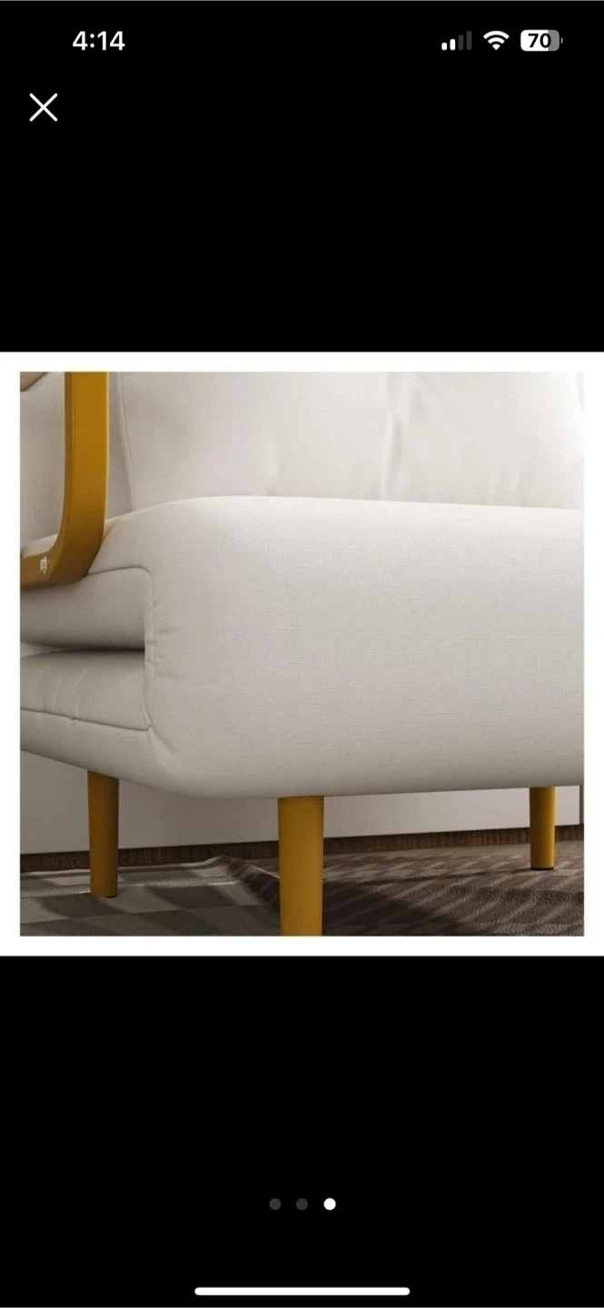 This is a white convertible sofa bed chair. It's made with a fabric material and has gold-coloured metal legs and armrests. It can be used as a chair or a bed.