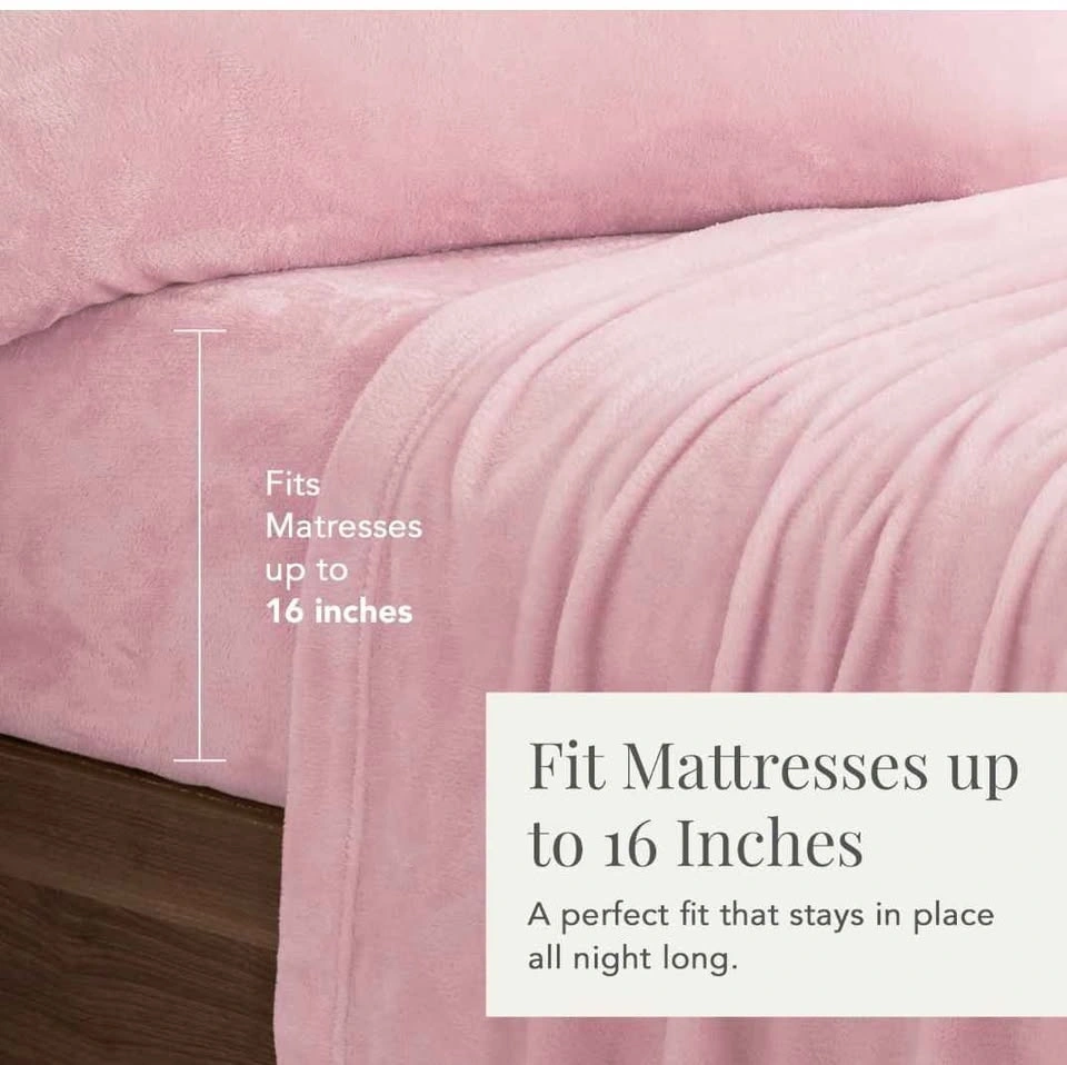 Cozy pink fuzzy queen sheet set. Comes with 1 fitted sheet (60x80 in), 1 flat sheet (90x102 in), and 2 pillowcases (20x30 in). Fitted sheet fits mattresses up to 16 inches deep. Easy to care for, machine washable in cold water, tumble dry low. Sheets are fade, stain, shrink, and pill resistant.