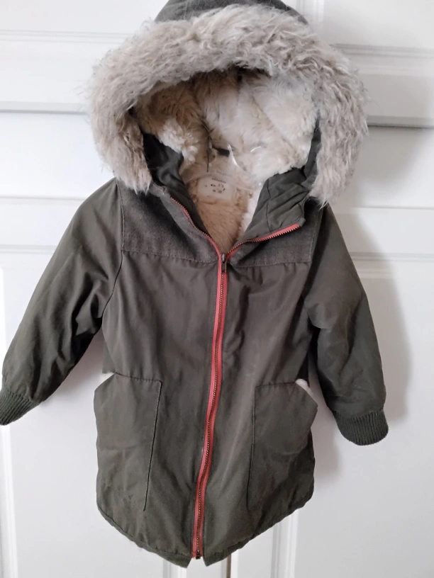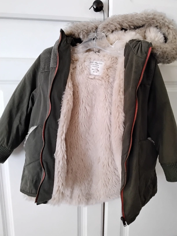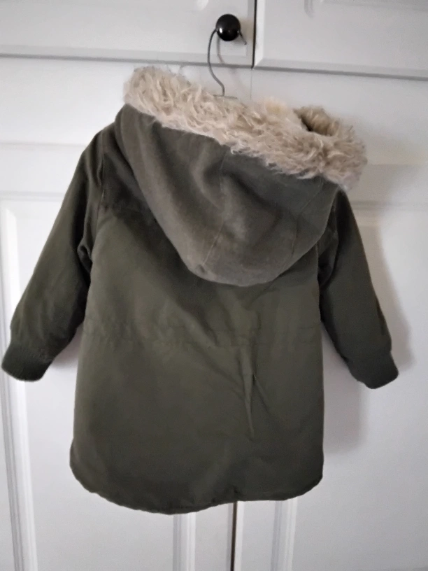 Green winter jacket with a faux fur lined hood. It is for girls ages 2 to 3 but is big fitting so definitely good for a 3 year old. Lovely army green color and very warm and stylish! Porch pick up available at Bristol and Creditview road from a clean and smoke and pet free home.