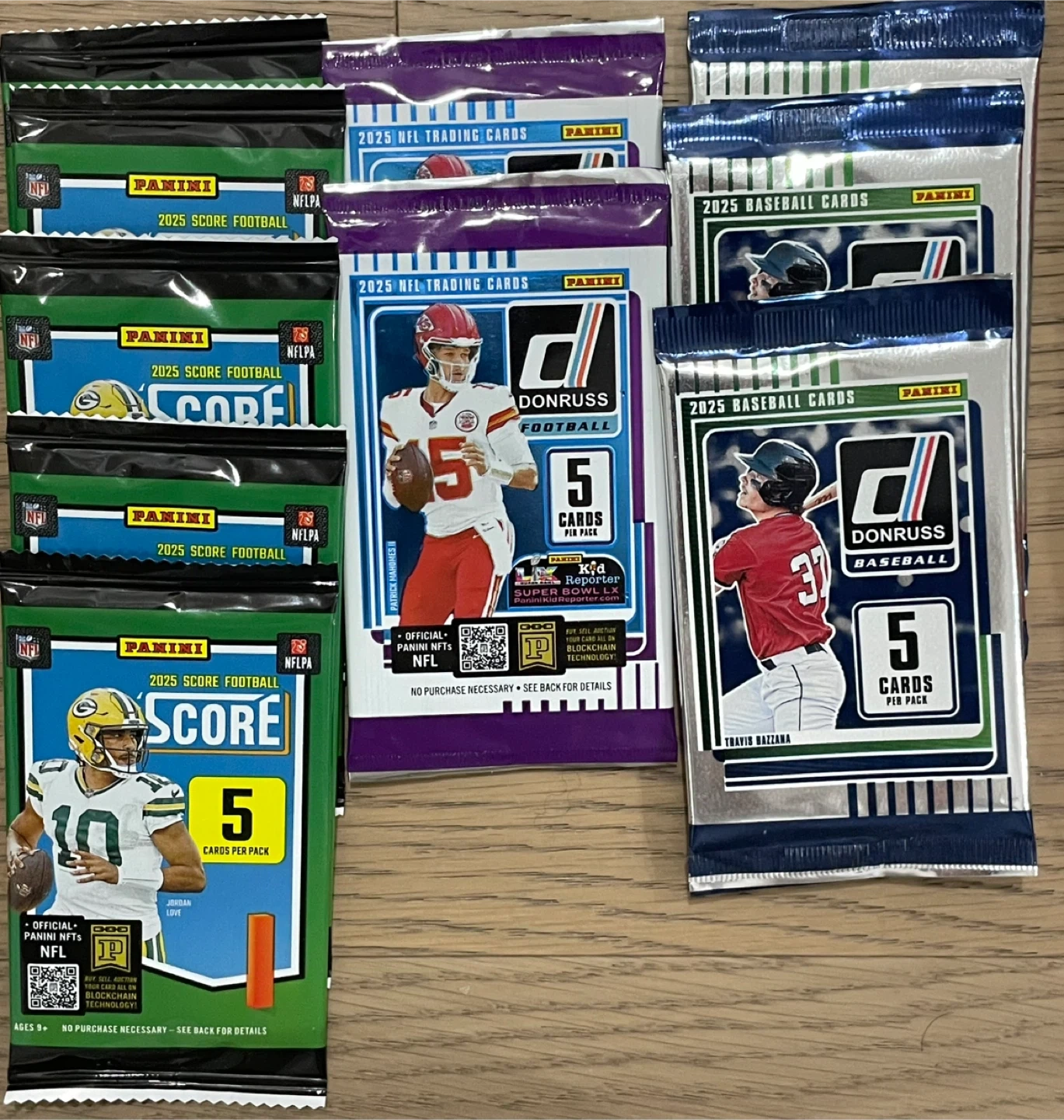I have some unopened packs of 2025 Panini NFL and Baseball trading cards! Each pack contains 5 cards. Great for collectors or anyone looking to start a new hobby.