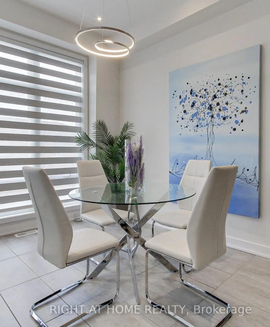 This set includes a round glass-top dining table with a chrome base and four white faux-leather chairs. The table's modern design and the chairs' sleek look make it a stylish addition to any dining area.
