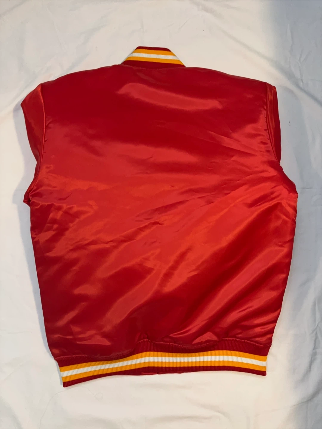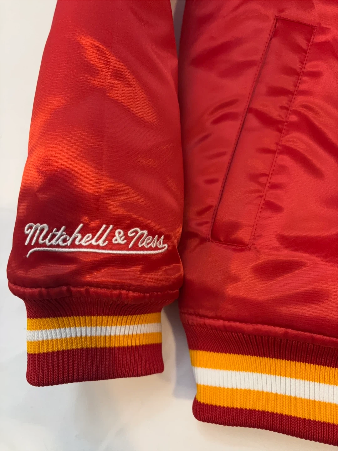 Classic Kansas City Chiefs NFL Mitchell & Ness bomber jacket. Vibrant red satin shell. Quilted interior with stitched labels. Sporty, vintage-inspired look. Please note there is a small mark on the inside of the jacket as shown in photo. $60 cash, porch pick up Kennedy and Eglinton.