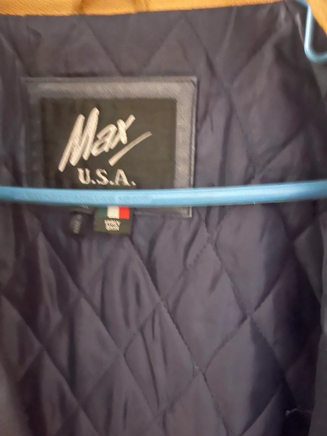 Selling a Max U.S.A. motocross leather jacket. It features a black and tan color scheme with various motocross patches. The jacket appears to be in good condition and has a quilted lining. Perfect for any motocross enthusiast!