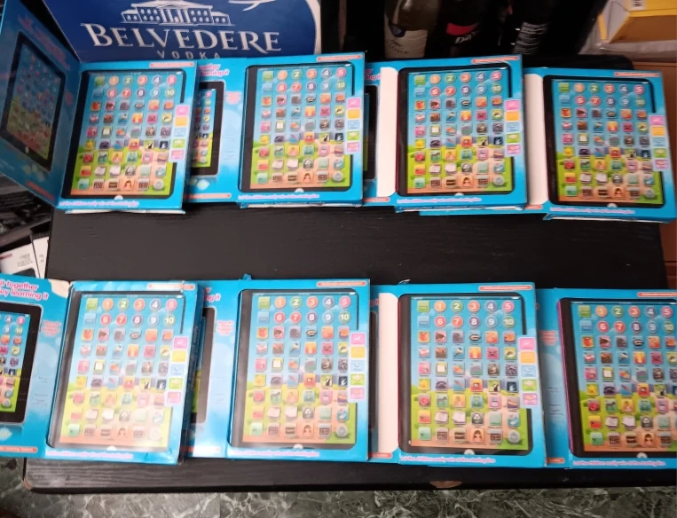 Touch panel learning machine. Features music, repeat, and spell learning functions. Includes a keyboard with numbers and letters. Great For early childhood learning. Available in blue and pink