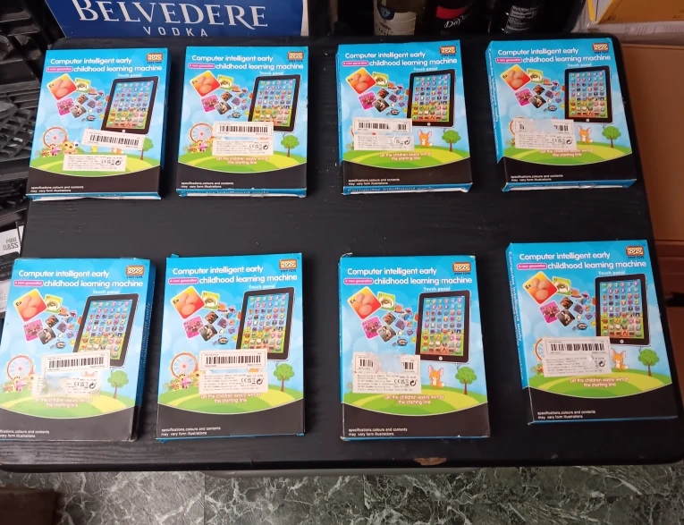 Touch panel learning machine. Features music, repeat, and spell learning functions. Includes a keyboard with numbers and letters. Great For early childhood learning. Available in blue and pink