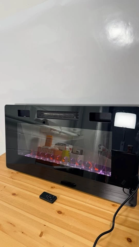 New electric fireplace. Ultra-thin modern design with low noise operation. Fits 2x4 and 2x6 stud walls. Can be recessed or wall mounted.