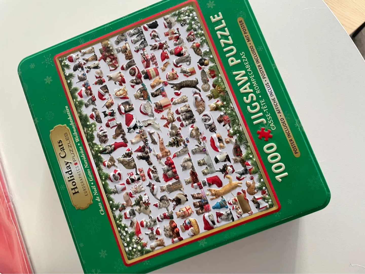 This is a 1000-piece jigsaw puzzle featuring holiday cats. It's a Eurographics puzzle and comes with a poster. Great for cat lovers who enjoy a festive challenge!