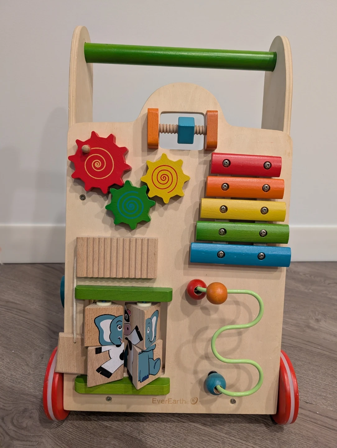 This is an EverEarth wooden activity walker with xylophone, gears, and bead maze. It's made of wood and features colourful interactive elements. Great for little ones learning to walk and explore!