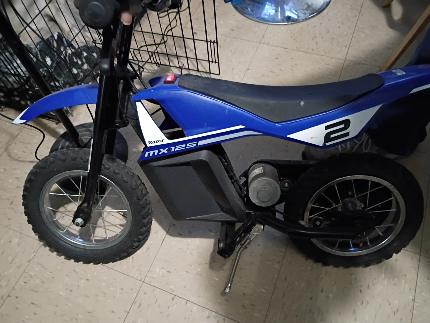 Selling a Razor MX125 Dirt Rocket electric bike. It's blue and white. The motor model is MY6812B-12, manufactured in 2021 July. It's in good condition and ready for some fun rides!🥕