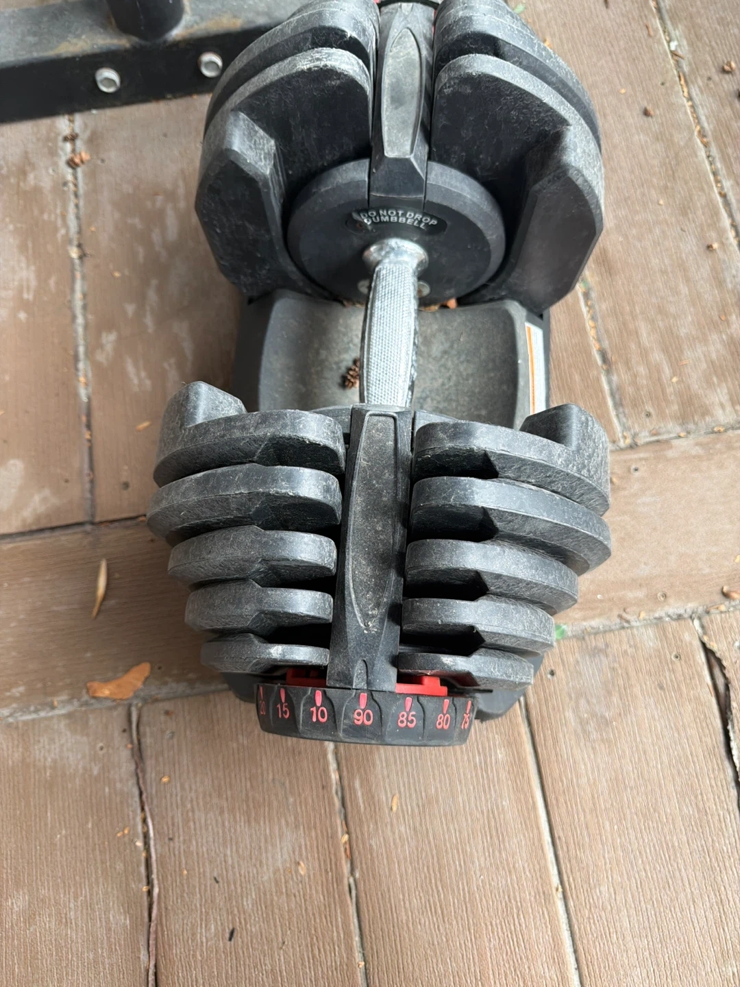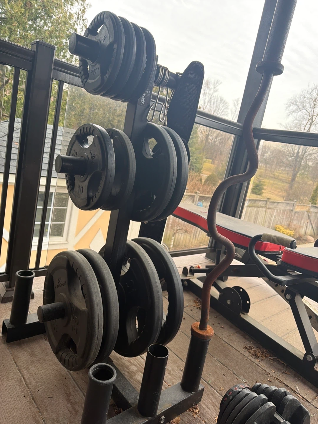 Adjustable dumbbells with a weight range dial up to 90 lbs and a multi-position weight bench. Includes a rack for weight plates and a curl bar. Perfect for a home gym setup! I will also include a bicep curl for the attachment of the bench seat