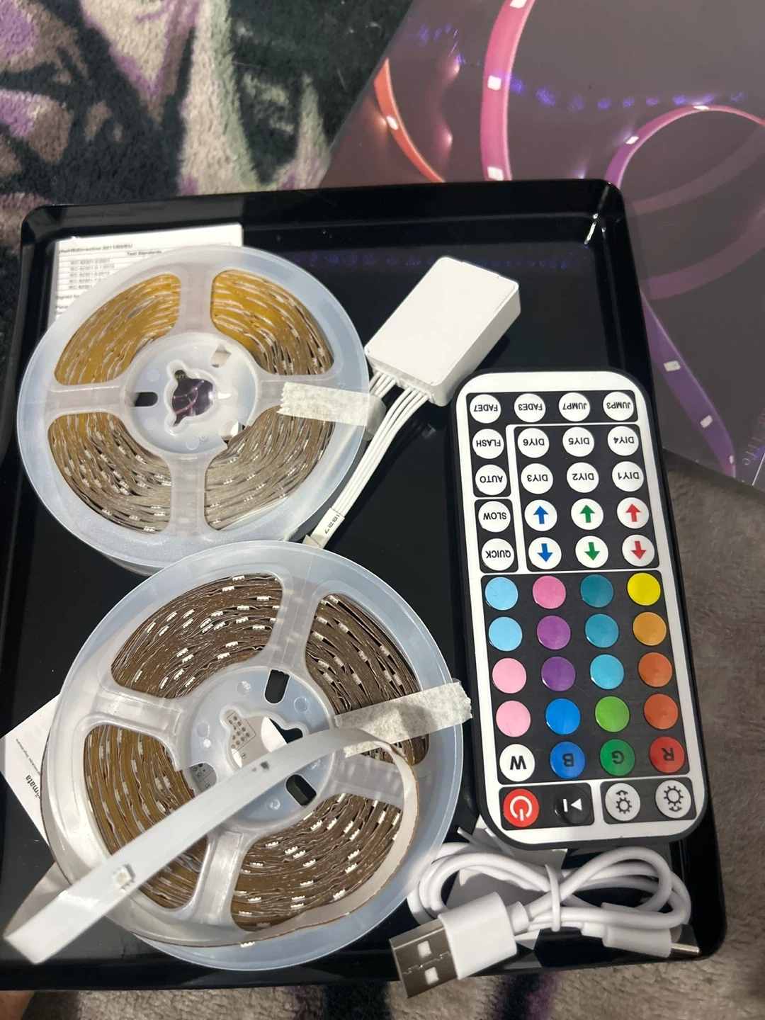Add some ambiance to your space with these LED strip lights! Comes with a remote to control the colours and modes. Includes two rolls of LED lights, a controller, a remote and a USB cable