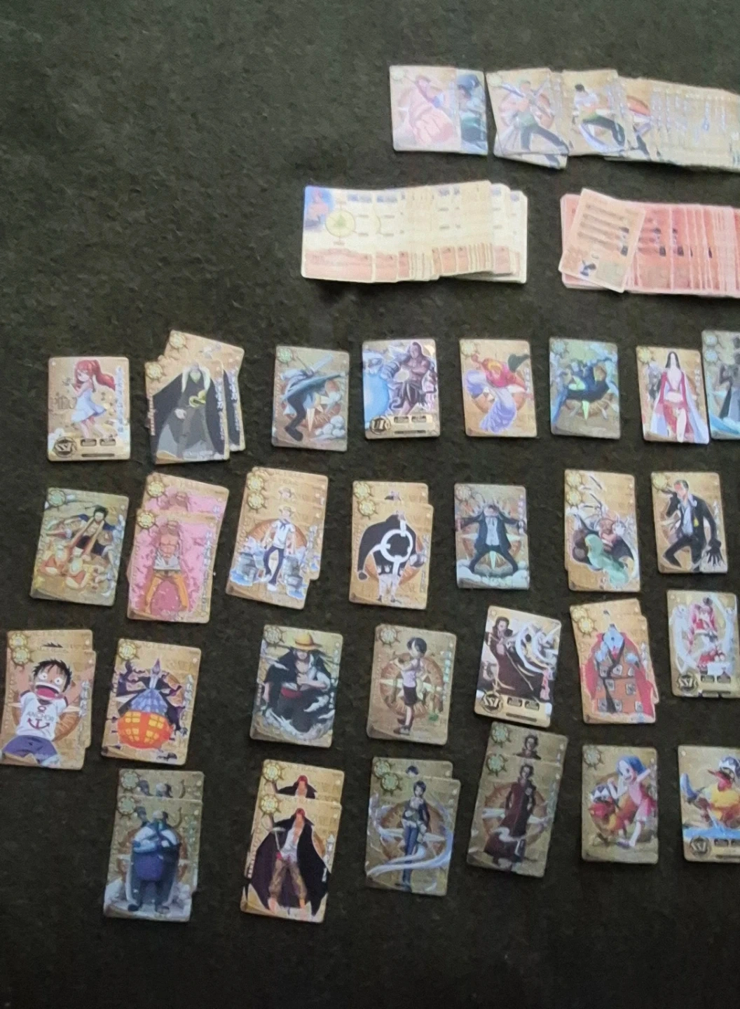 Selling a mixed lot of trading cards featuring both Pokemon and One Piece characters. Great for collectors or fans of either series!