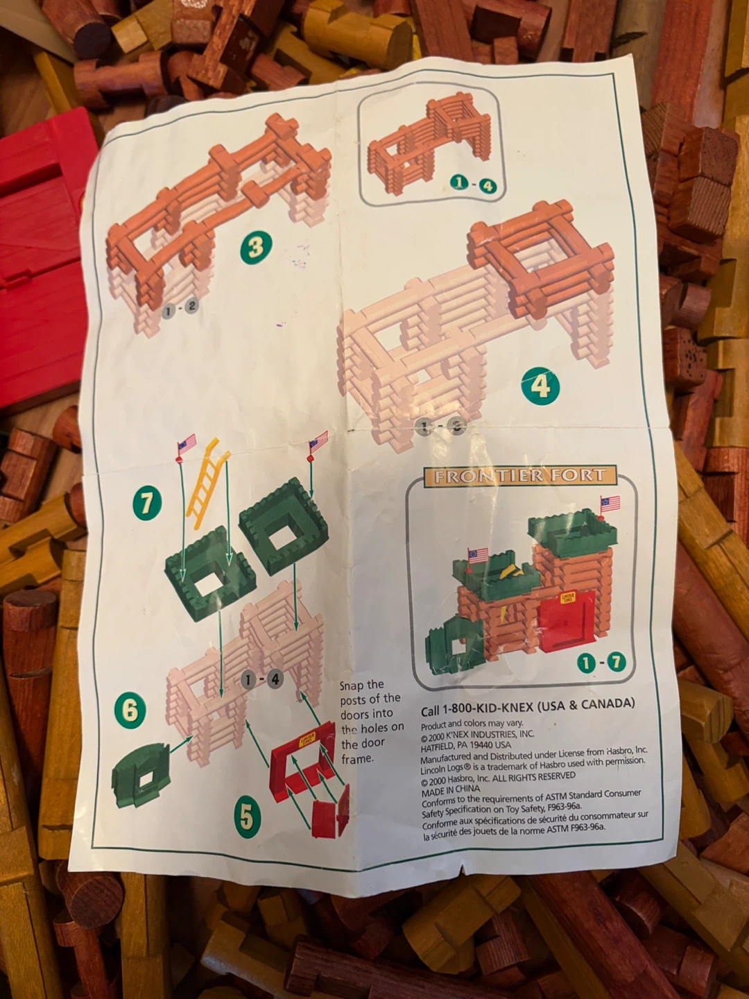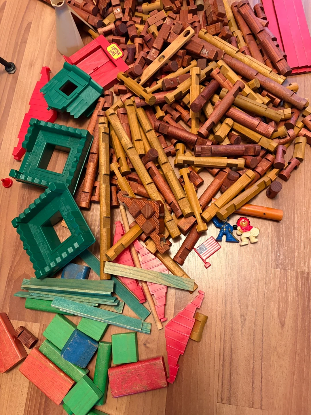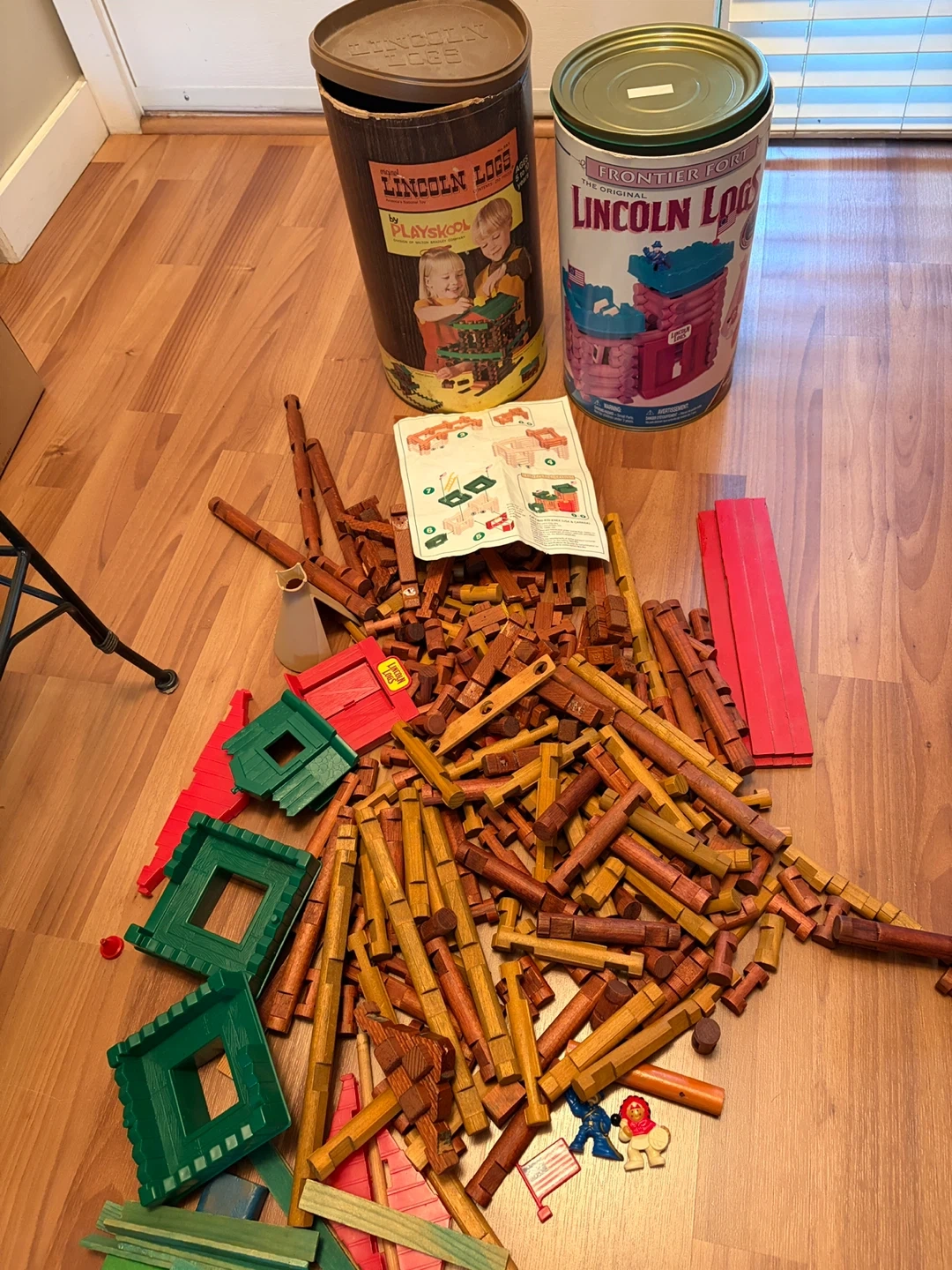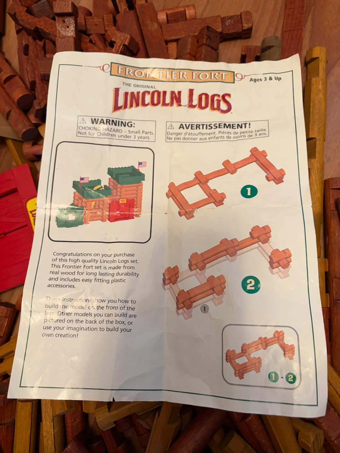 This is a large set of Lincoln Logs Frontier Fort building pieces. It includes numerous wooden logs, green and red plastic fort pieces, and small figures. The set comes with an instruction manual for building the fort. Plenty of pieces for creative construction! Currently in Langley