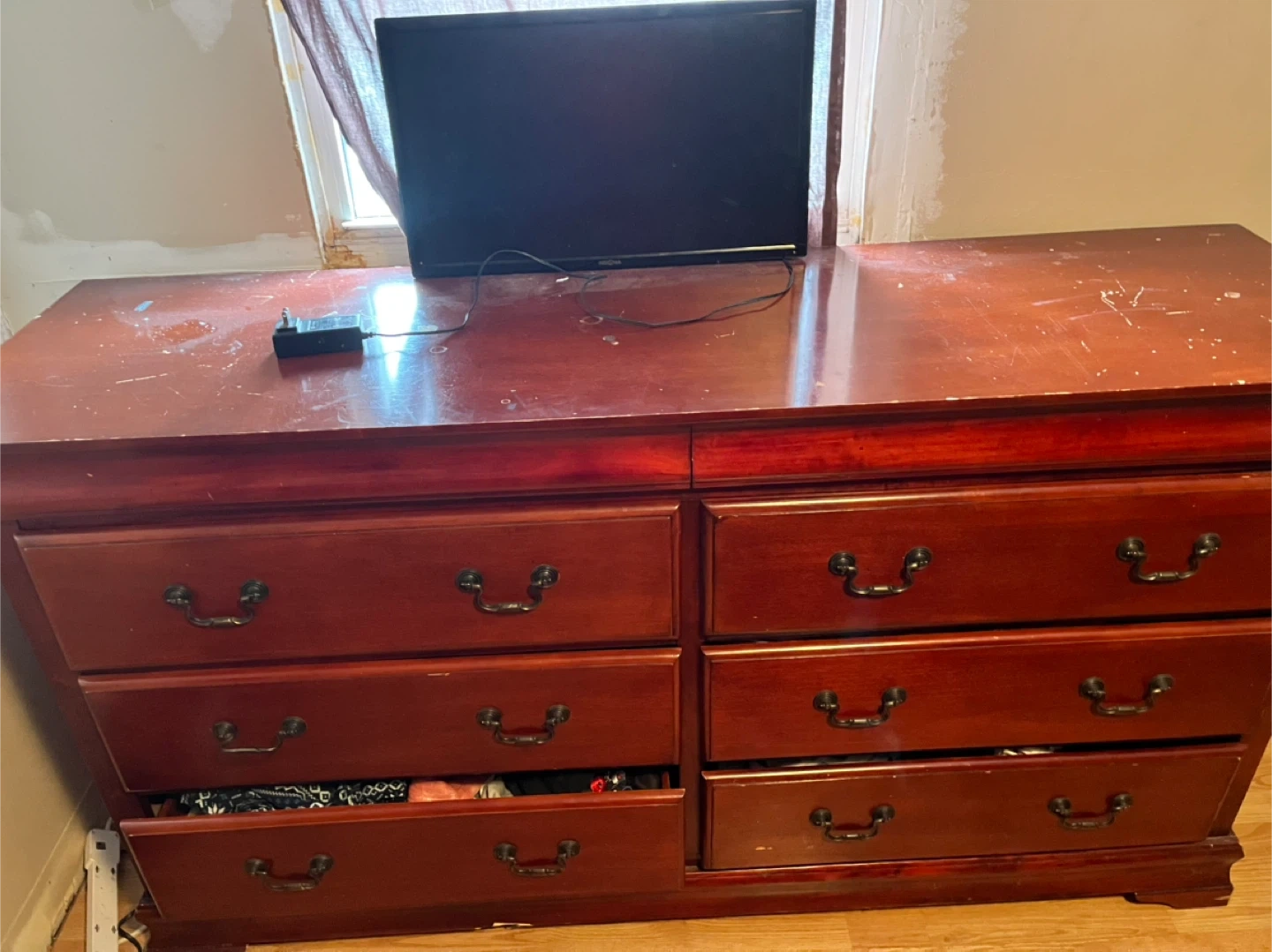 A wooden dresser with a rich cherry finish. It features eight drawers for storage. This dresser would be useful for organizing clothes and linens.