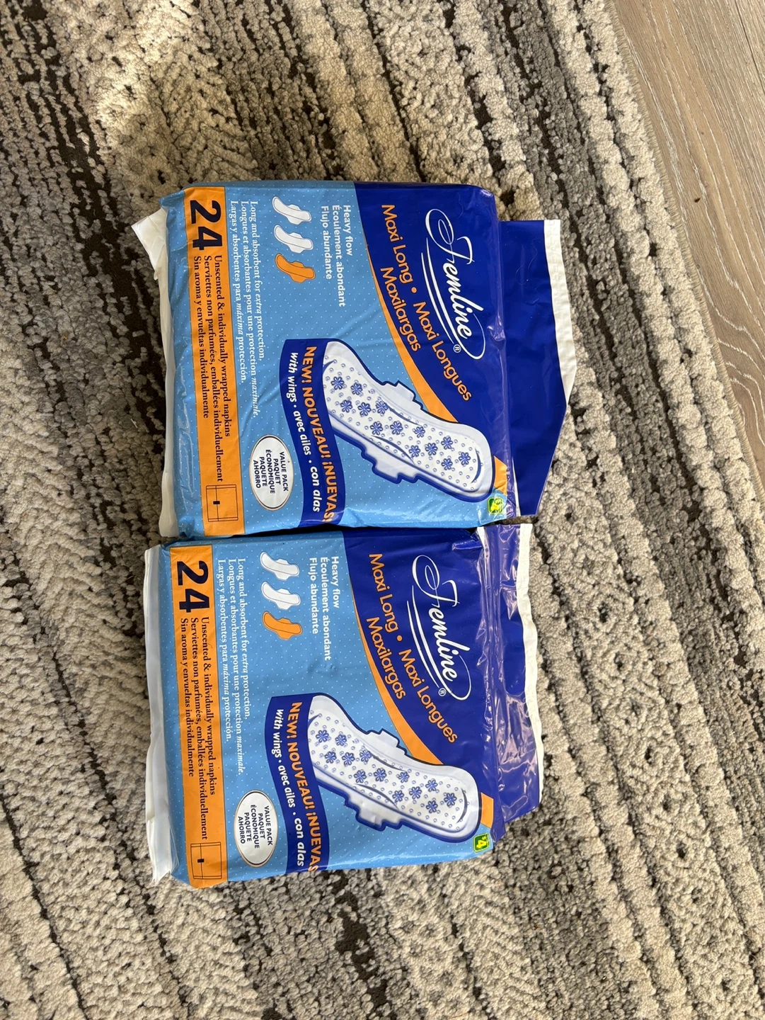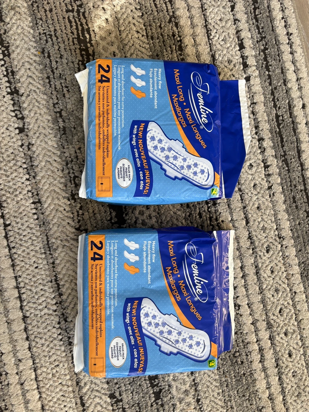 Brand new Two packs of Femine Maxi Long pads included, each containing 24 pads. These pads offer heavy flow absorbency and are individually wrapped for protection. They're designed for maximum coverage and leak protection. $ 3 .50 each