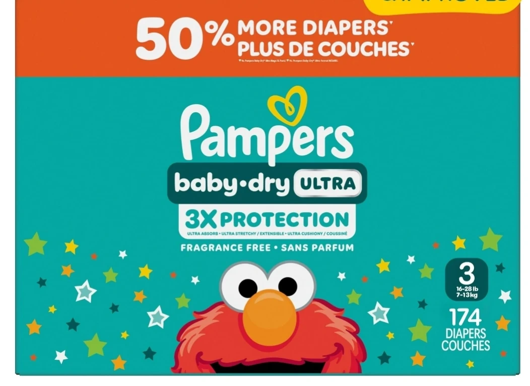 Pampers Baby-Dry Ultra diapers in size 3. These are fragrance-free and offer 3X protection. Each pack contains 174 diapers, suitable for babies 16-28 lb (7-13 kg). Brand new in box. Son outgrew them.