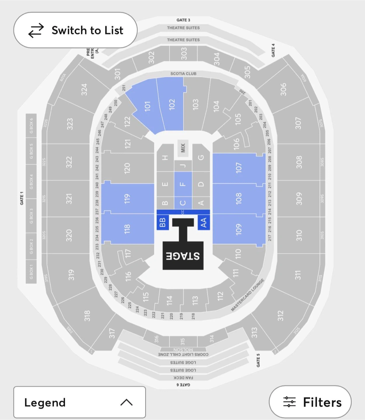 Ticket for Karan Aujla's concert on Sunday, May 10, 2026, at 8:00 PM. Venue is Scotiabank Arena in Toronto, ON. The tickets are available in different sections. DM for more info.