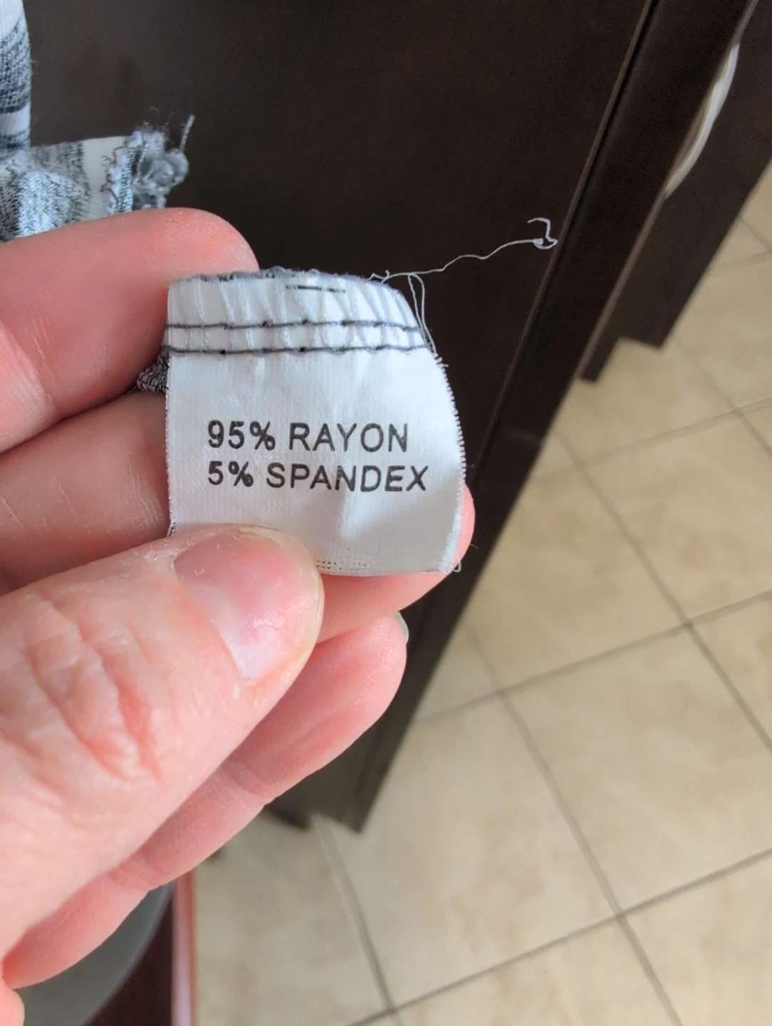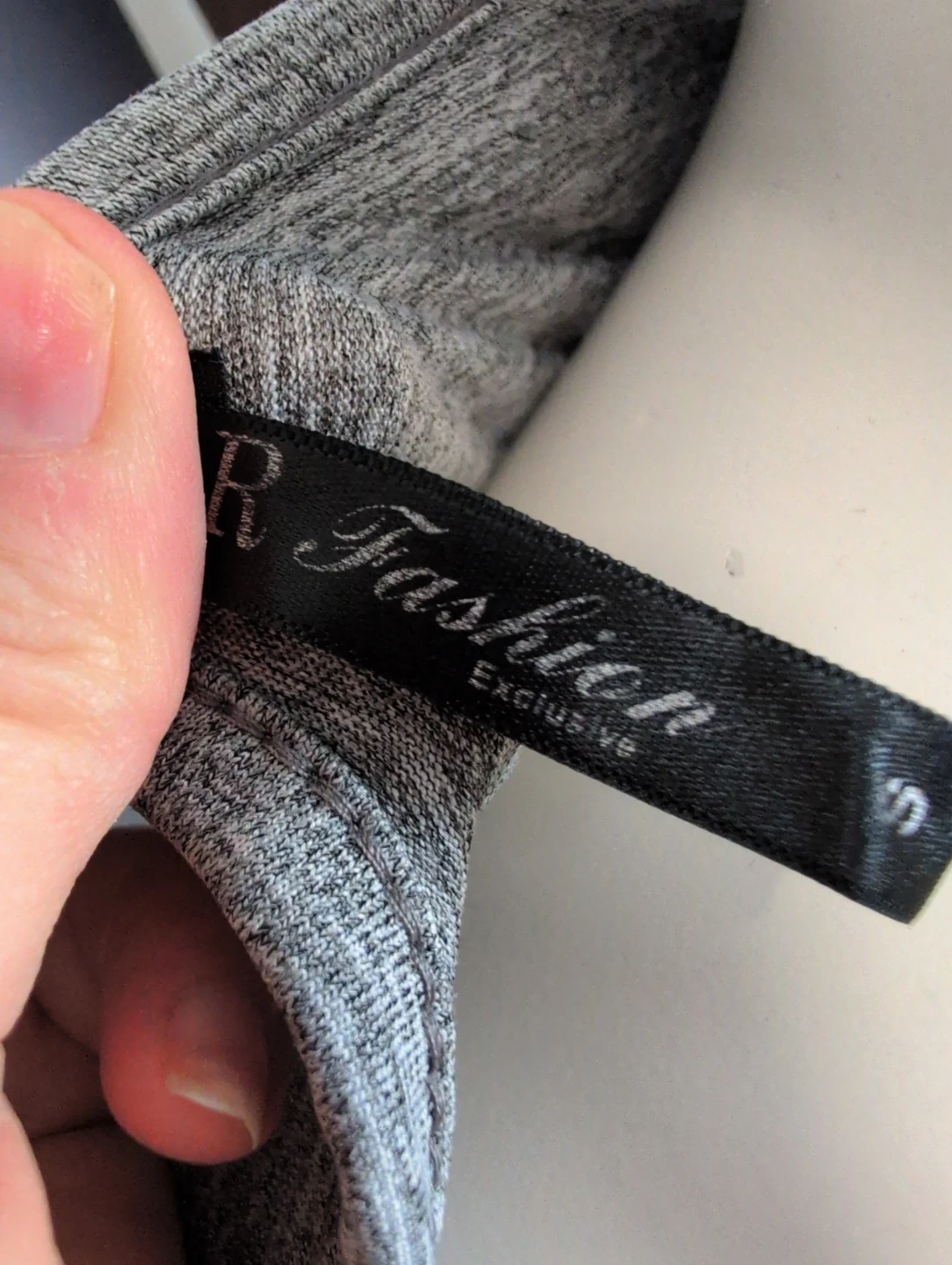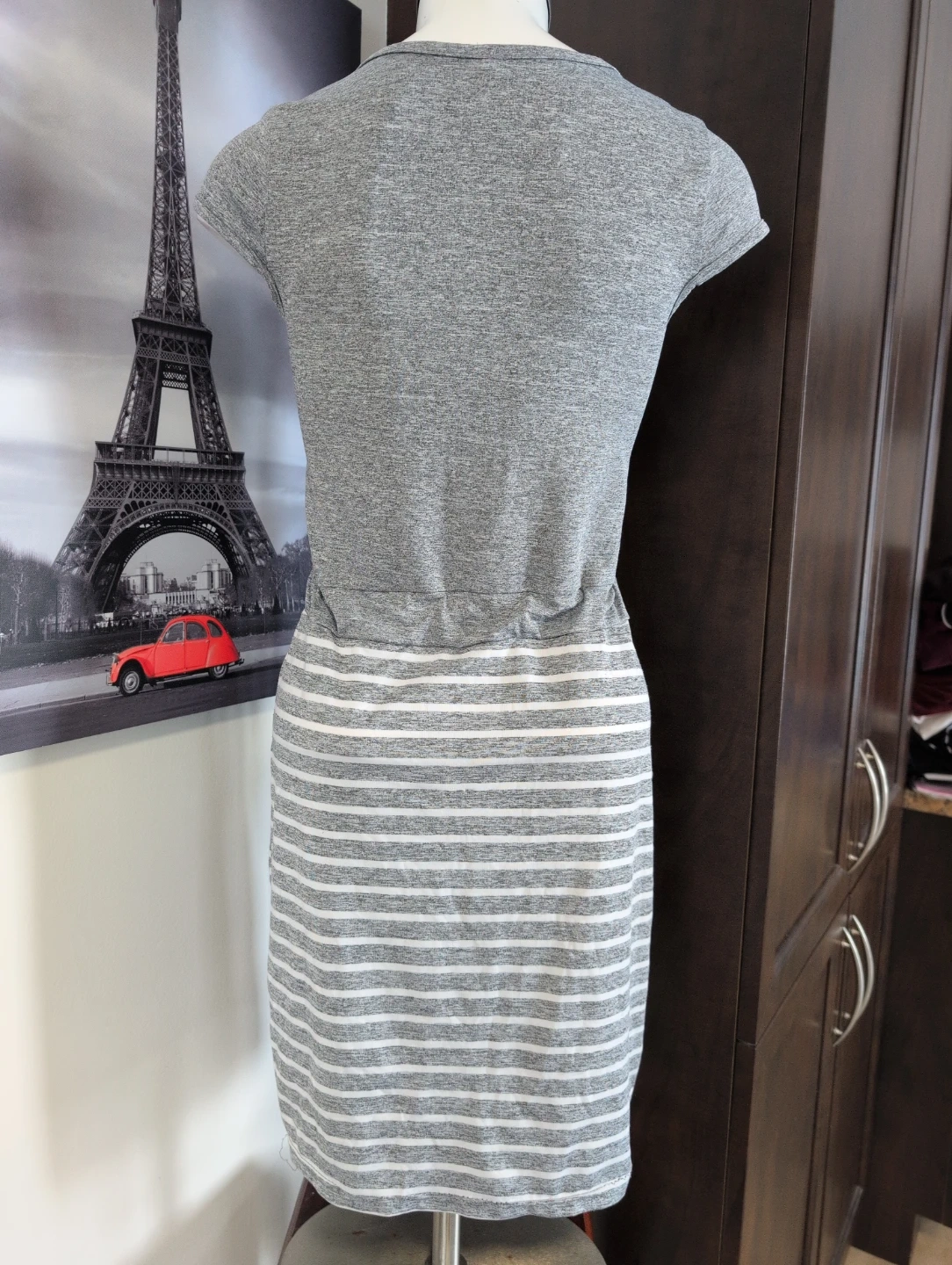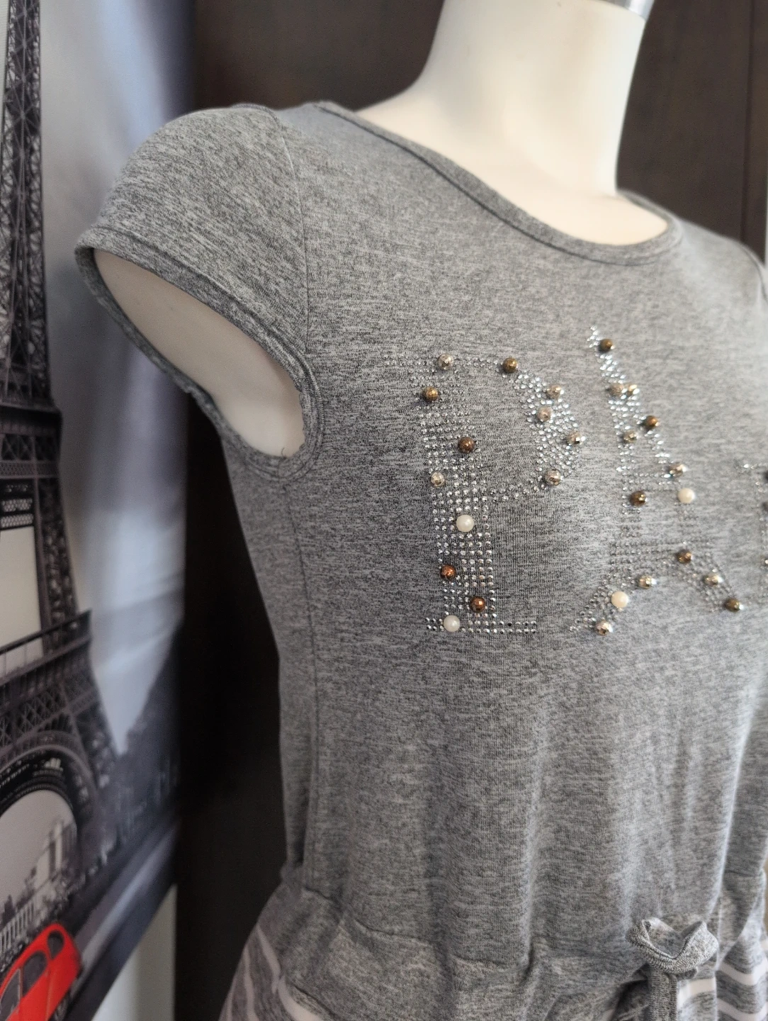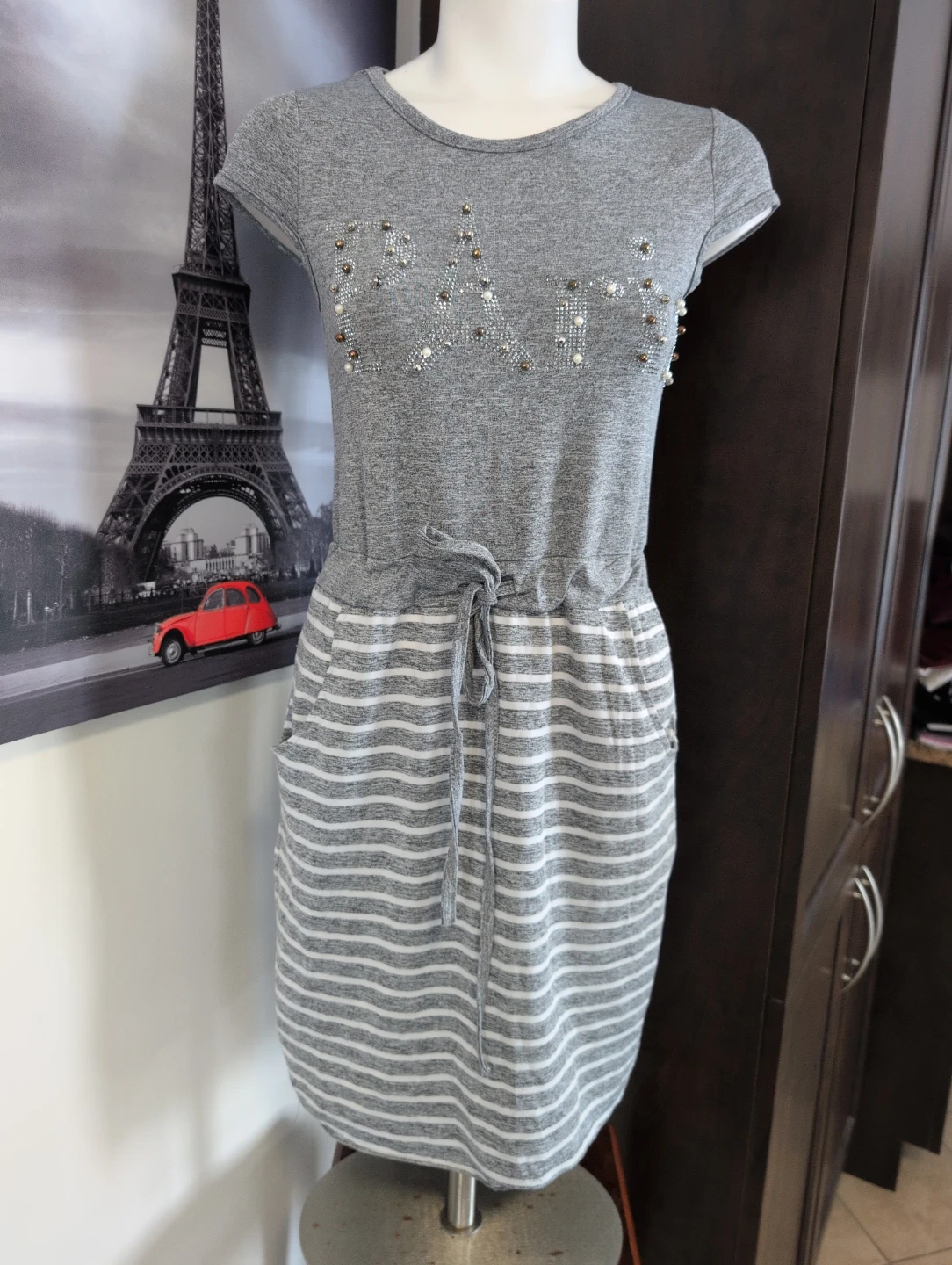 Grey marled knit t-shirt dress featuring a drawstring waist. The bodice has an embellished logo with pearls and rhinestones. The skirt portion is a grey and white stripe pattern with side pockets. It's a casual and comfy option for everyday wear!