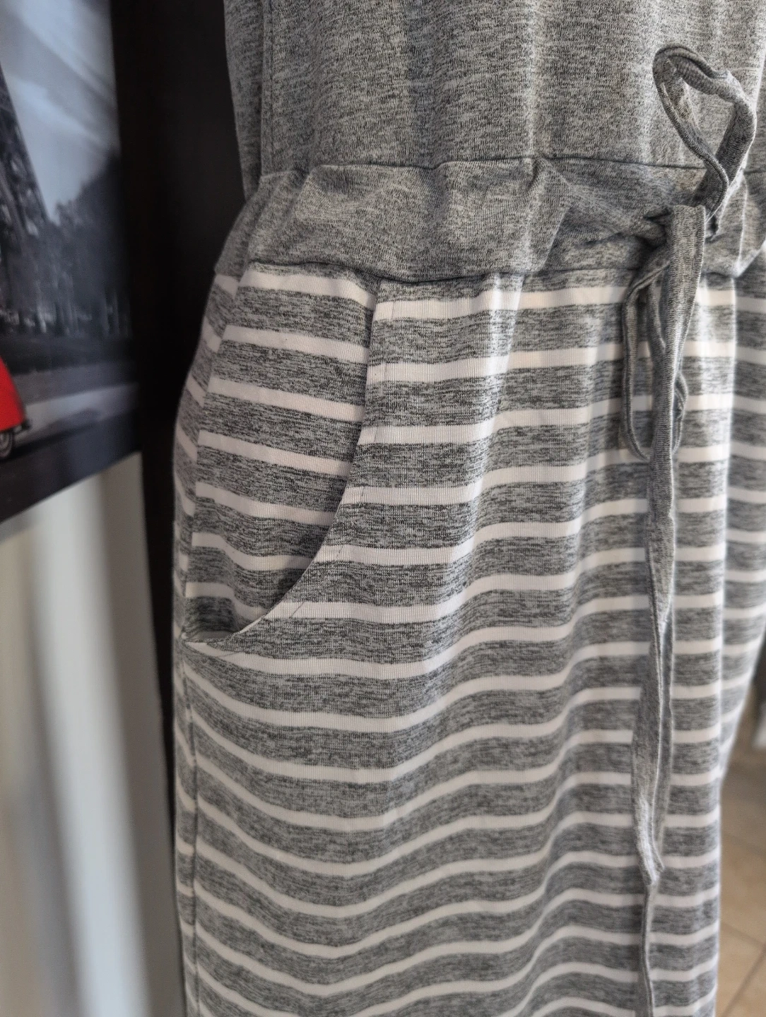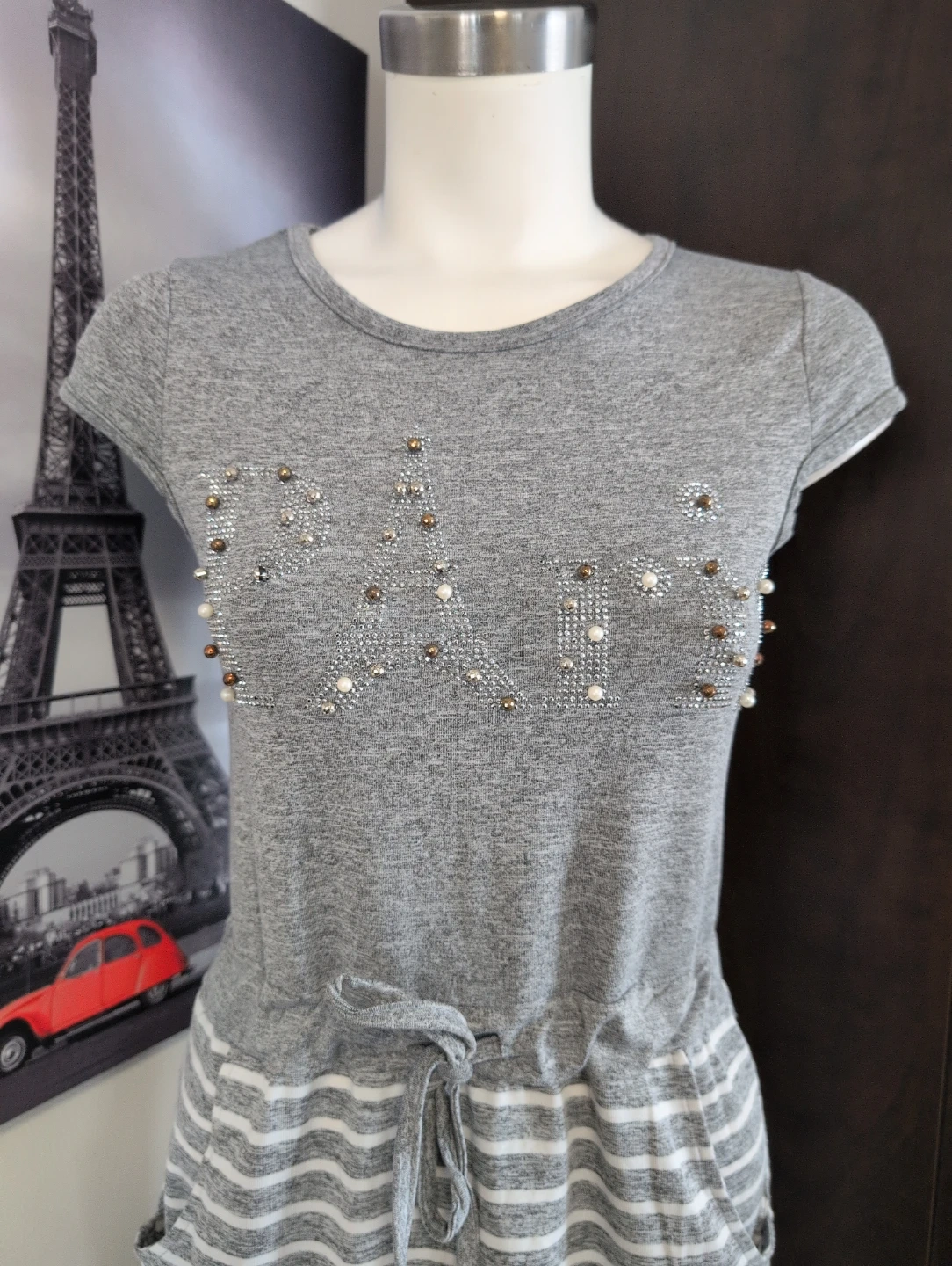 Grey marled knit t-shirt dress featuring a drawstring waist. The bodice has an embellished logo with pearls and rhinestones. The skirt portion is a grey and white stripe pattern with side pockets. It's a casual and comfy option for everyday wear!
