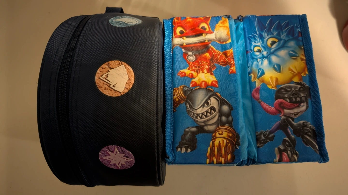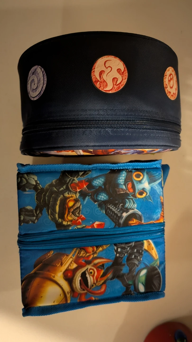 This Skylanders pencil case and round bag set features colourful graphics from the game. The pencil case zips open to reveal storage for pens and pencils, and the round bag zips closed for carrying items. They're great for fans of the Skylanders franchise!