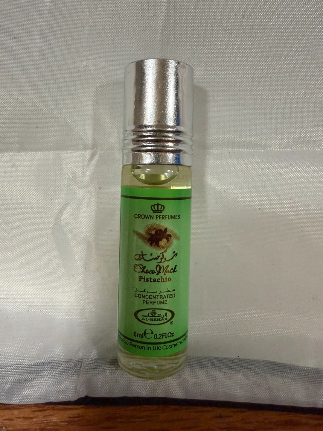 This is Al-Rehab concentrated perfume oil in Choco Musk Pistachio scent. It's a 6ml roll-on bottle. The fragrance is a blend of chocolate, musk, and pistachio notes. Perfect for on-the-go application!