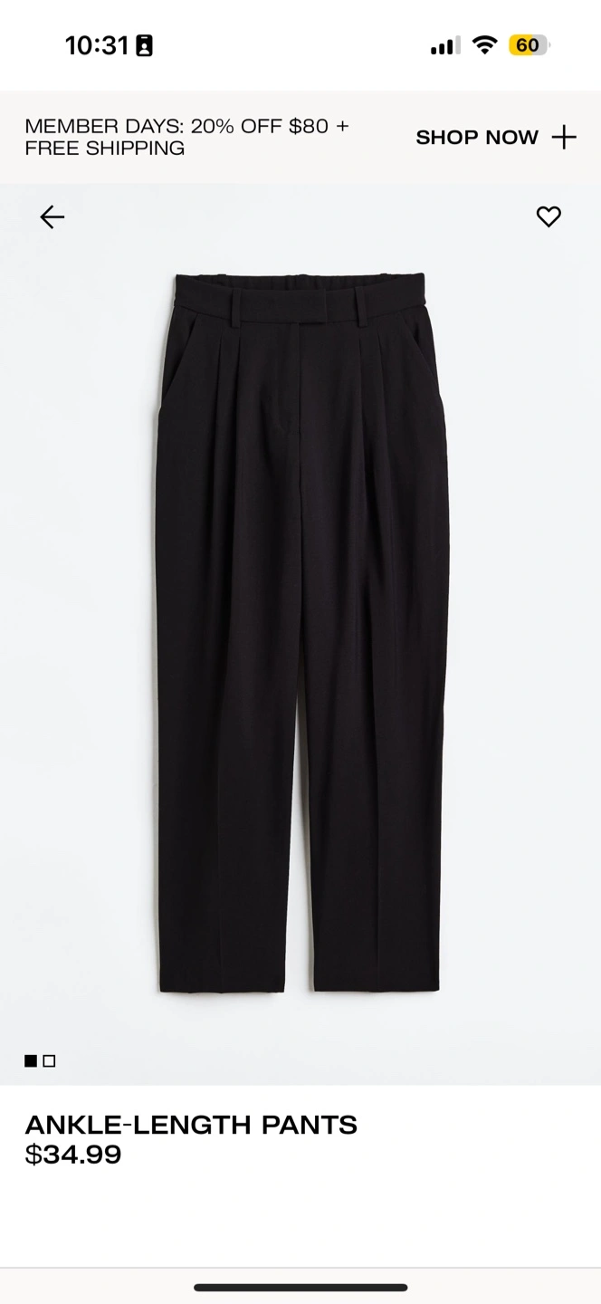 Buy & SellH&M Ankle-Length Black Pants NWT Size 4H&M Ankle-Length Black Pants NWT Size 4$20Black ankle-length pants. Pleated front. Size US 4. New with tags.ConditionNewSizeUS 4BrandH&MWHERE TO MEETKing and YorkView MapSELLERHannahFinancial District23219 reviews0 chats·0 favorites·16 viewsSEND CHAT TO SELLERHi Hannah! I’m interested in your listing.Hi Hannah! I’m interested in your listing.Get the Karrot app to chatSign In to chat