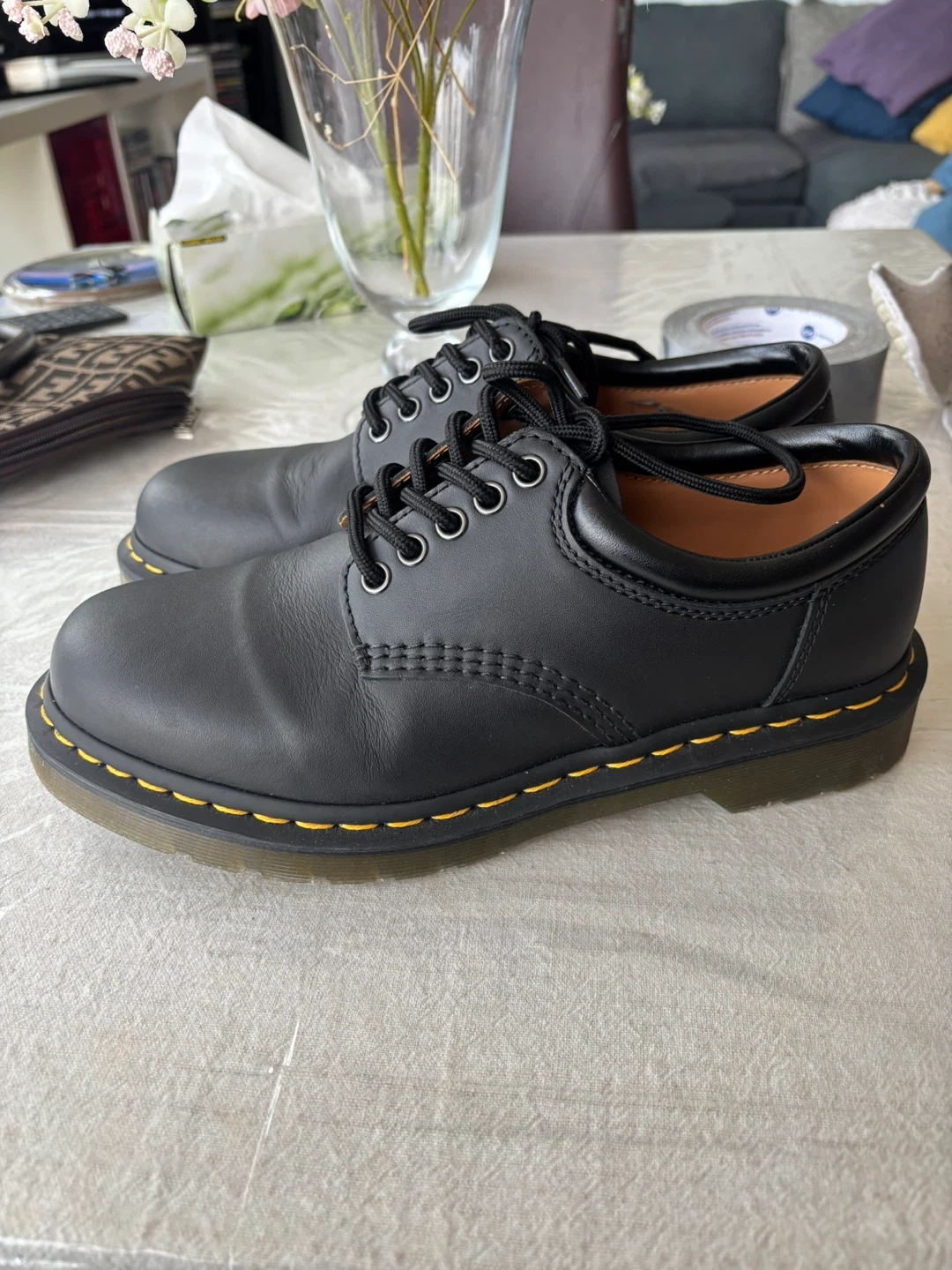 These are black leather Oxford shoes from Dr. Martens. They feature the iconic yellow stitching and durable air-cushioned soles. Made in Vietnam. Good for everyday wear.
