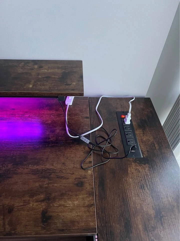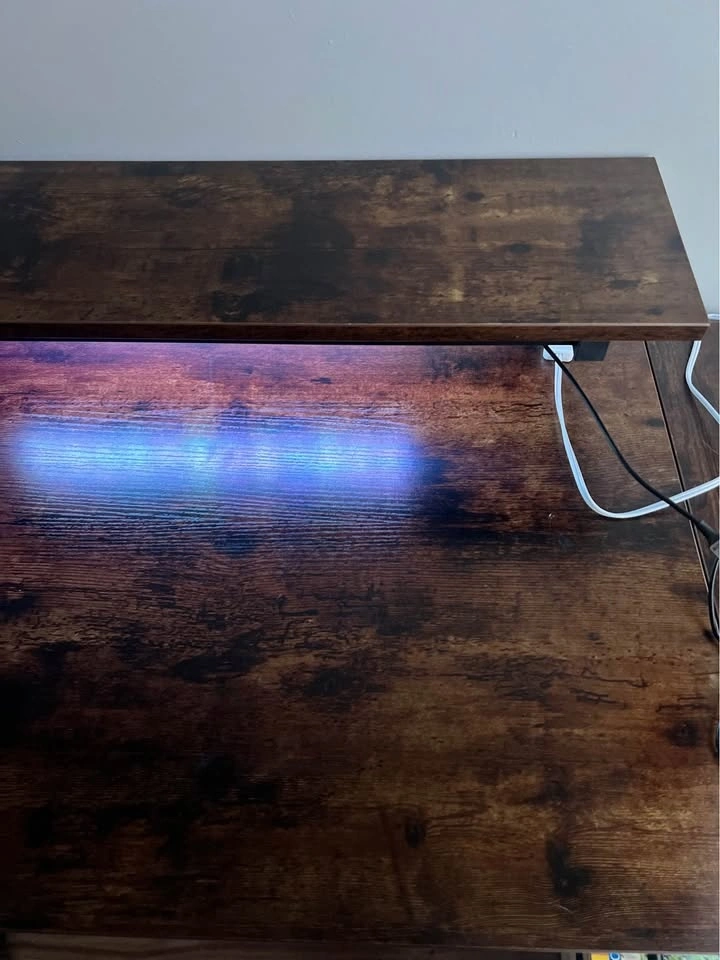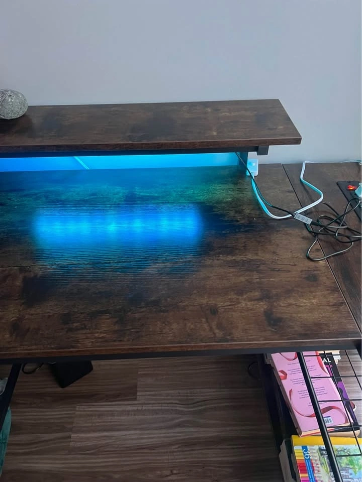 Moving abroad sale. Dimensions: 82D x 106.5W x 91.2H cm. Perfect work or gaming desk for small spaces, built-in LED lights with multiple settings, two storage shelves, monitor stand/top shelf, multiple power outlets including USB, 1 side hook. Pick up Coal Harbour.