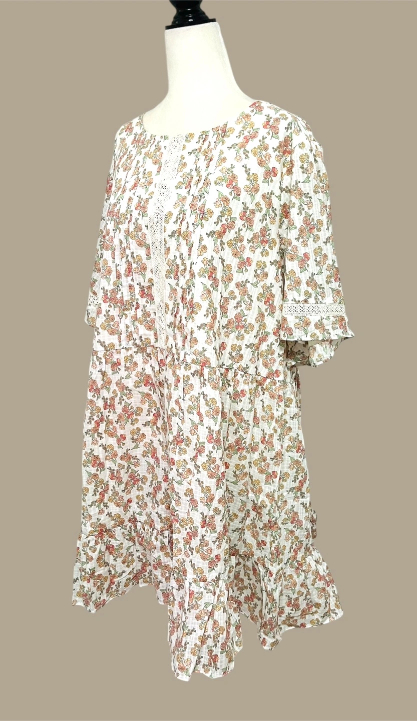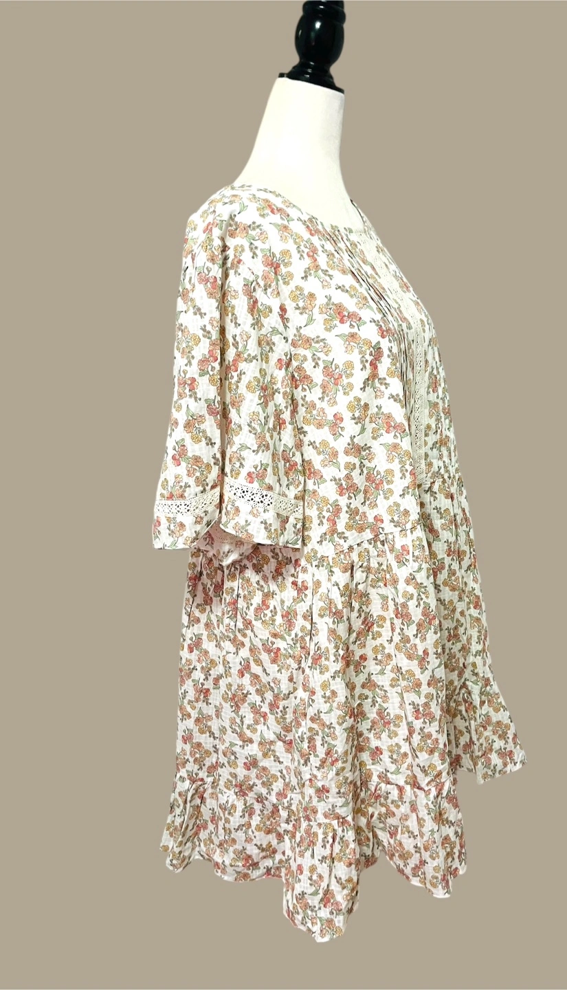 A cascade of delicate blooms awaits with this charming floral print dress. The eye is drawn to the intricate lace detailing that graces the bodice, adding a touch of vintage-inspired elegance. The playful ruffle hem creates a flirty silhouette, perfect for twirling through sun-drenched meadows or enjoying a picnic in the park. The lightweight fabric ensures breezy comfort, while the relaxed fit allows for effortless movement. Picture yourself wearing this dress to a garden party, a casual brunch with friends, or a romantic date night under the stars.