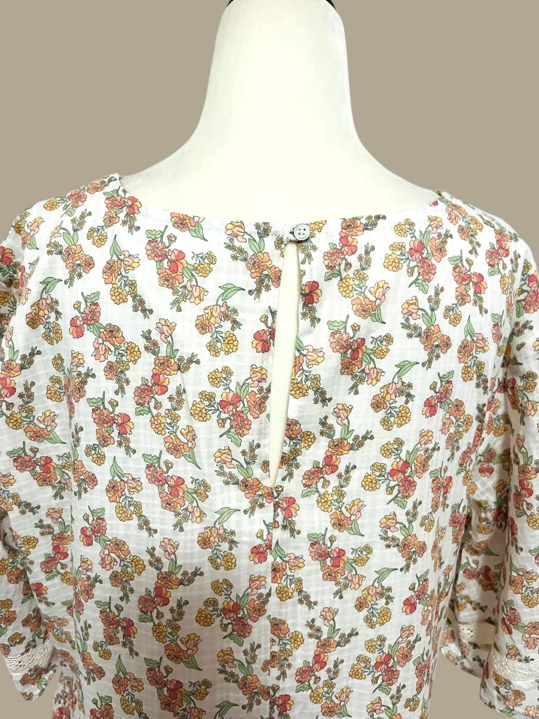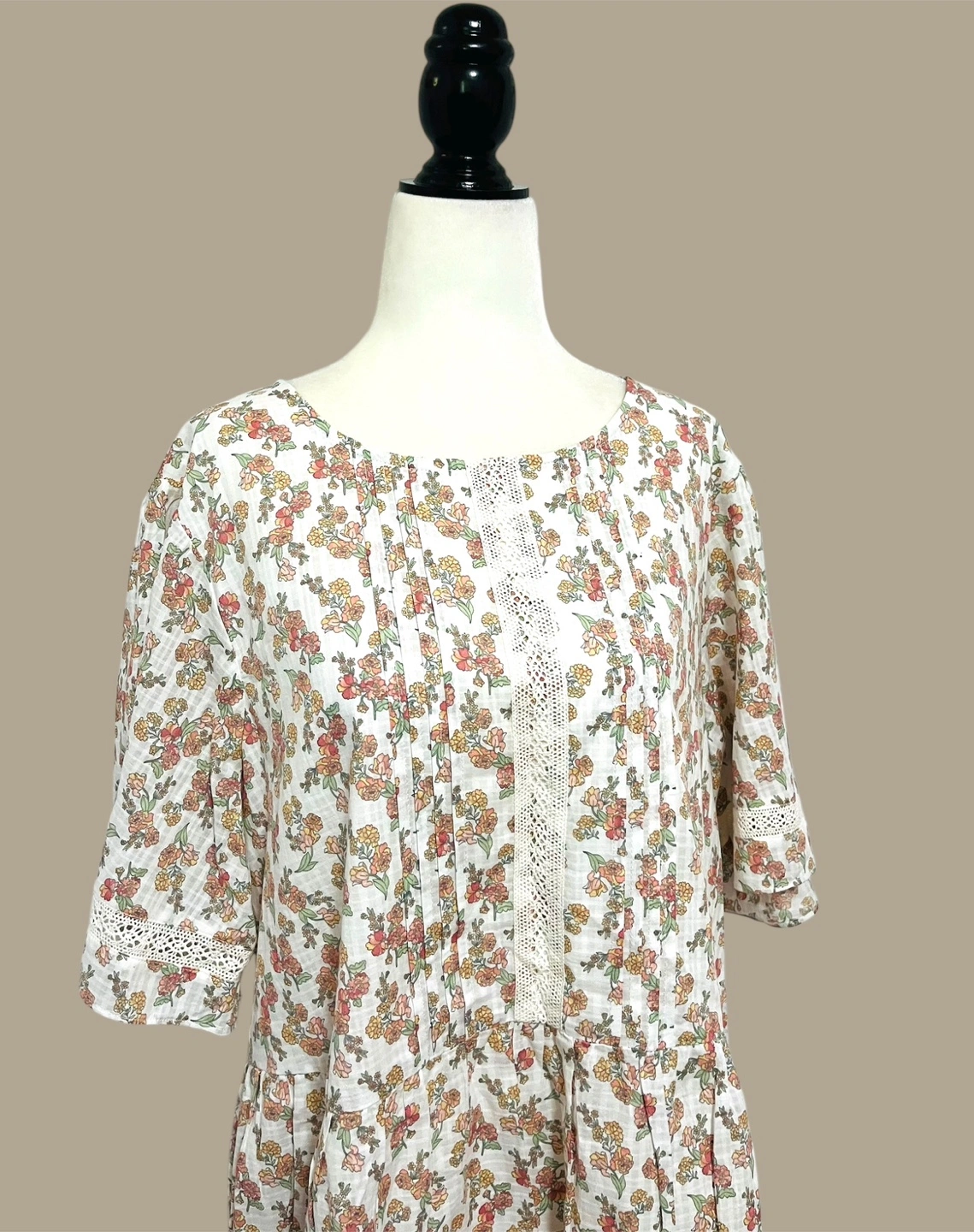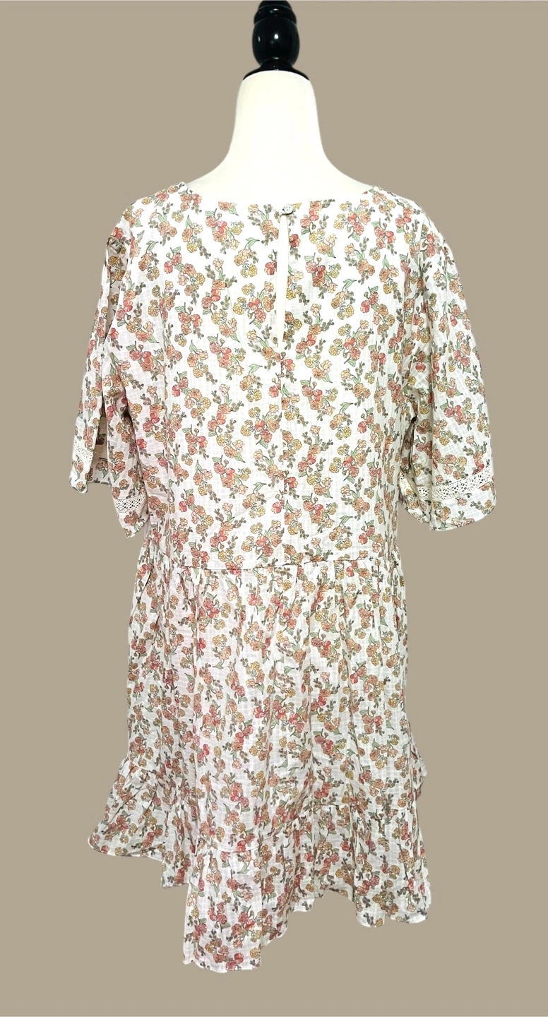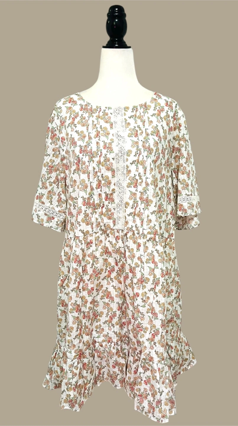 Keywords: floral dress, cottagecore dress, joe fresh dress, ruffle hem dress, casual dress, summer dress, floral print, lace detail, boho dress, bohemian dress, midi dress, womens dress, lightweight dress, loose fit dress