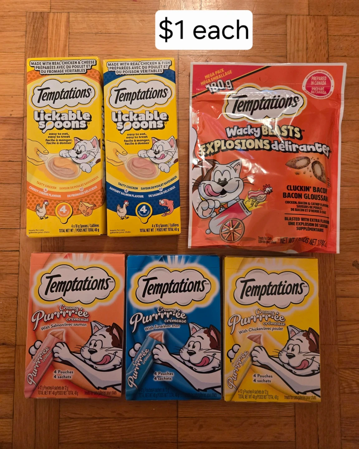 Various Temptations cat treats available, including Lickable Spoons in Tasty Chicken and Savoury Salmon flavours, and Creamy Purr-ée in Salmon, Tuna, and Chicken varieties. Wacky Blasts Cluckin' Bacon flavour also included. Each Lickable Spoons pack contains 4 x 10g spoons, and each Creamy Purr-ée pack contains 4 x 12g pouches.