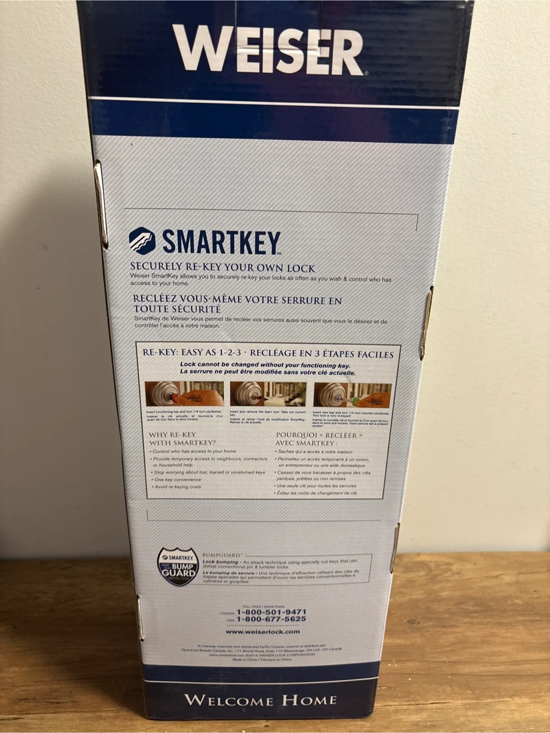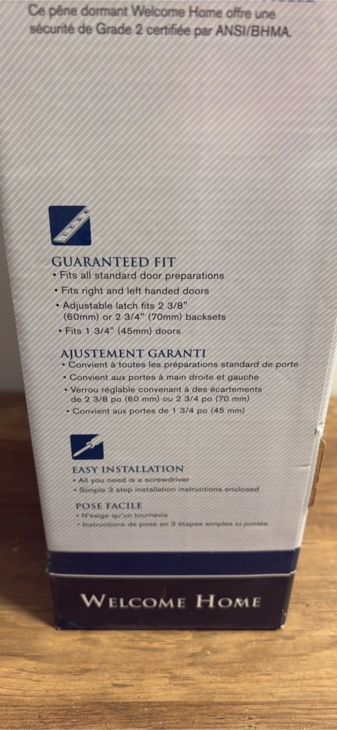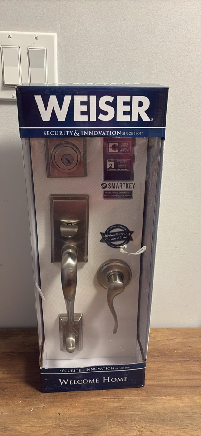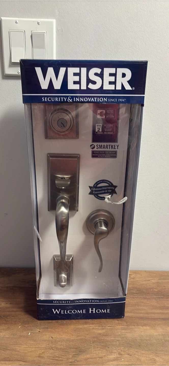 Brand new Weiser Welcome Home door lock set. Fits standard door preparations, both right and left-handed. Includes adjustable latches for 2 3/8" or 2 3/4" backsets and fits 1 3/4" doors. Easy installation with a screwdriver!