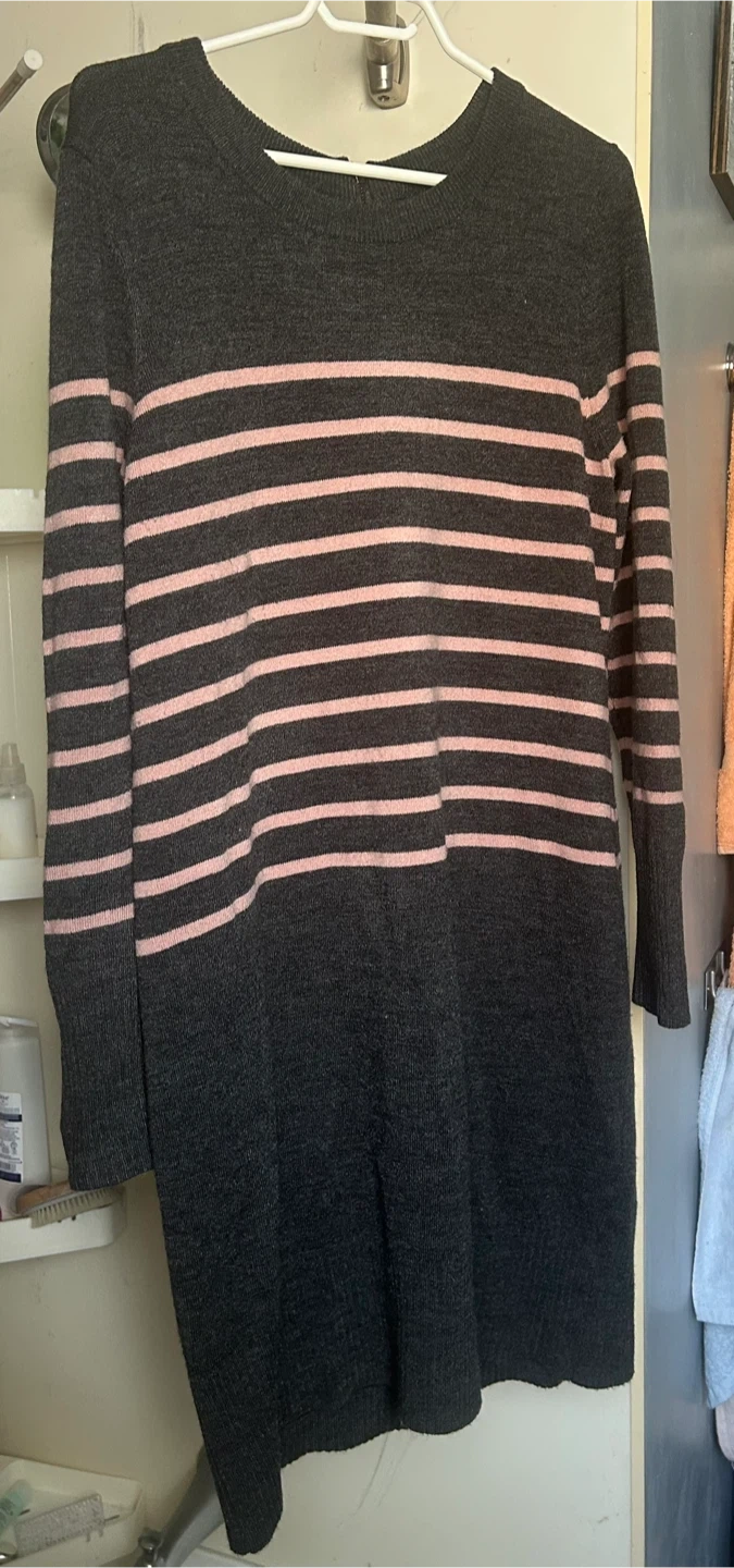 This is a Reitman’s women's sweater dress. It's a charcoal grey with light pink horizontal stripes. The material is a soft knit. This dress is great for casual wear! In excellent condition
