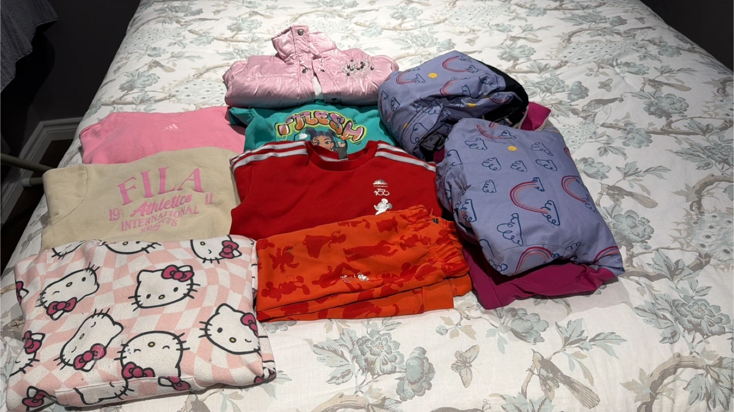 Selling a bundle of kids' clothing items! There's a mix of brands including Adidas, Fila, and Hello Kitty. Perfect for a little one's wardrobe! 6-8 years old girls, snow suit included