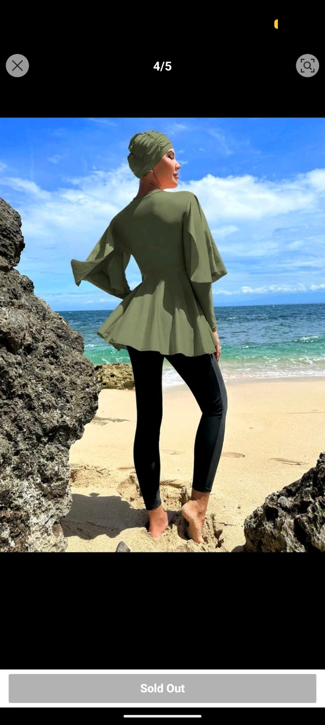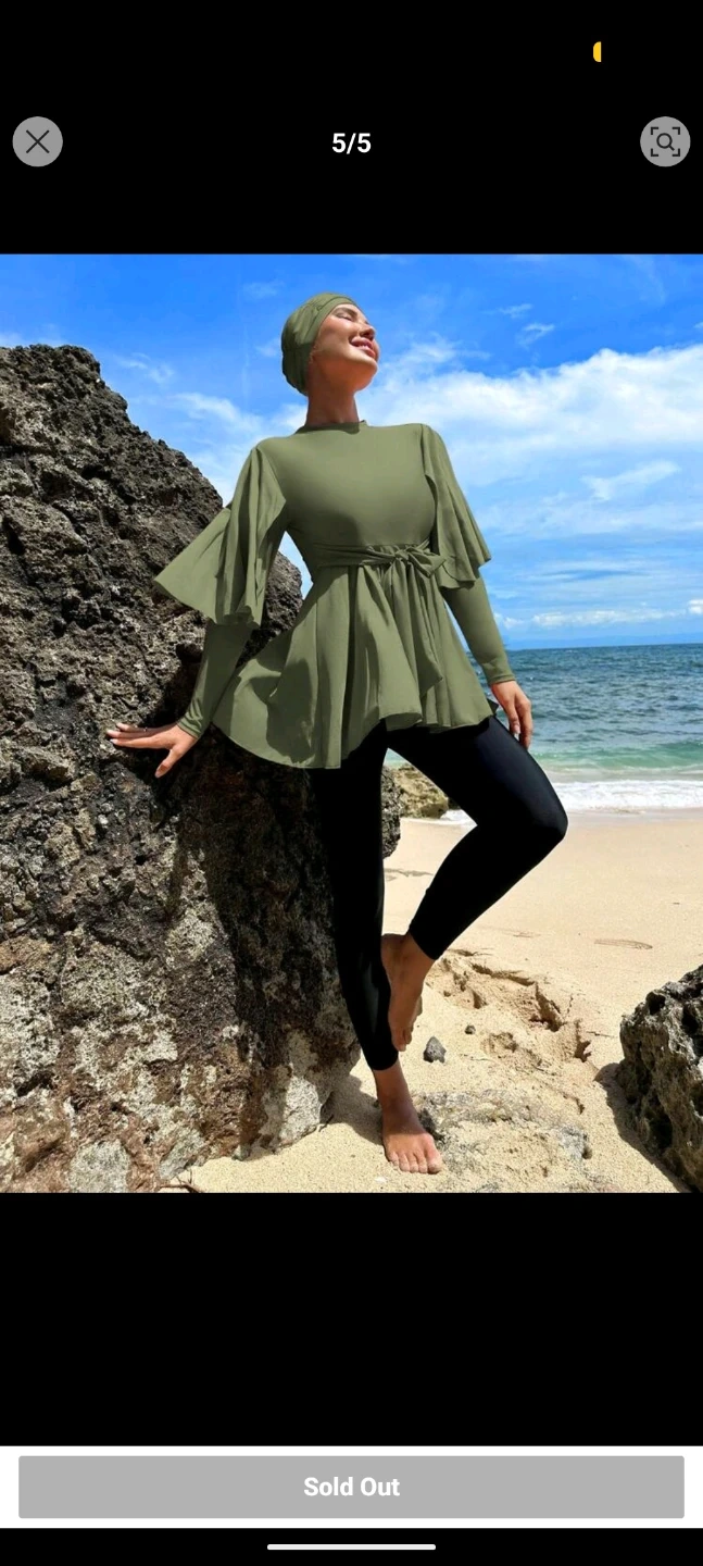 A women's burkini set with a long-sleeved belted top and swimming cap. Includes matching leggings. Olive green colour.