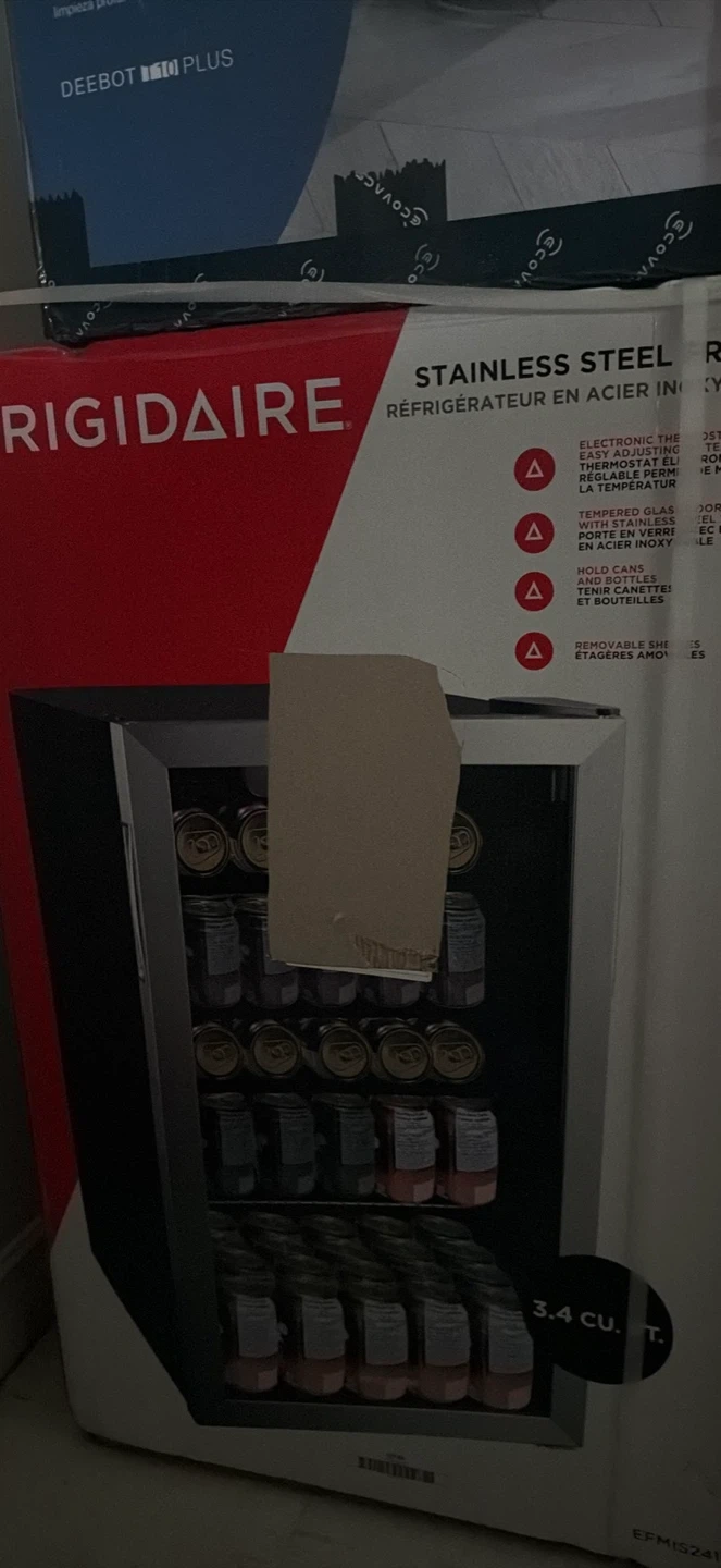 Frigidaire 3.4 cu. ft. stainless steel beverage cooler. It has electronic thermostat control and tempered glass doors. Features removable shelves for holding cans and bottles.