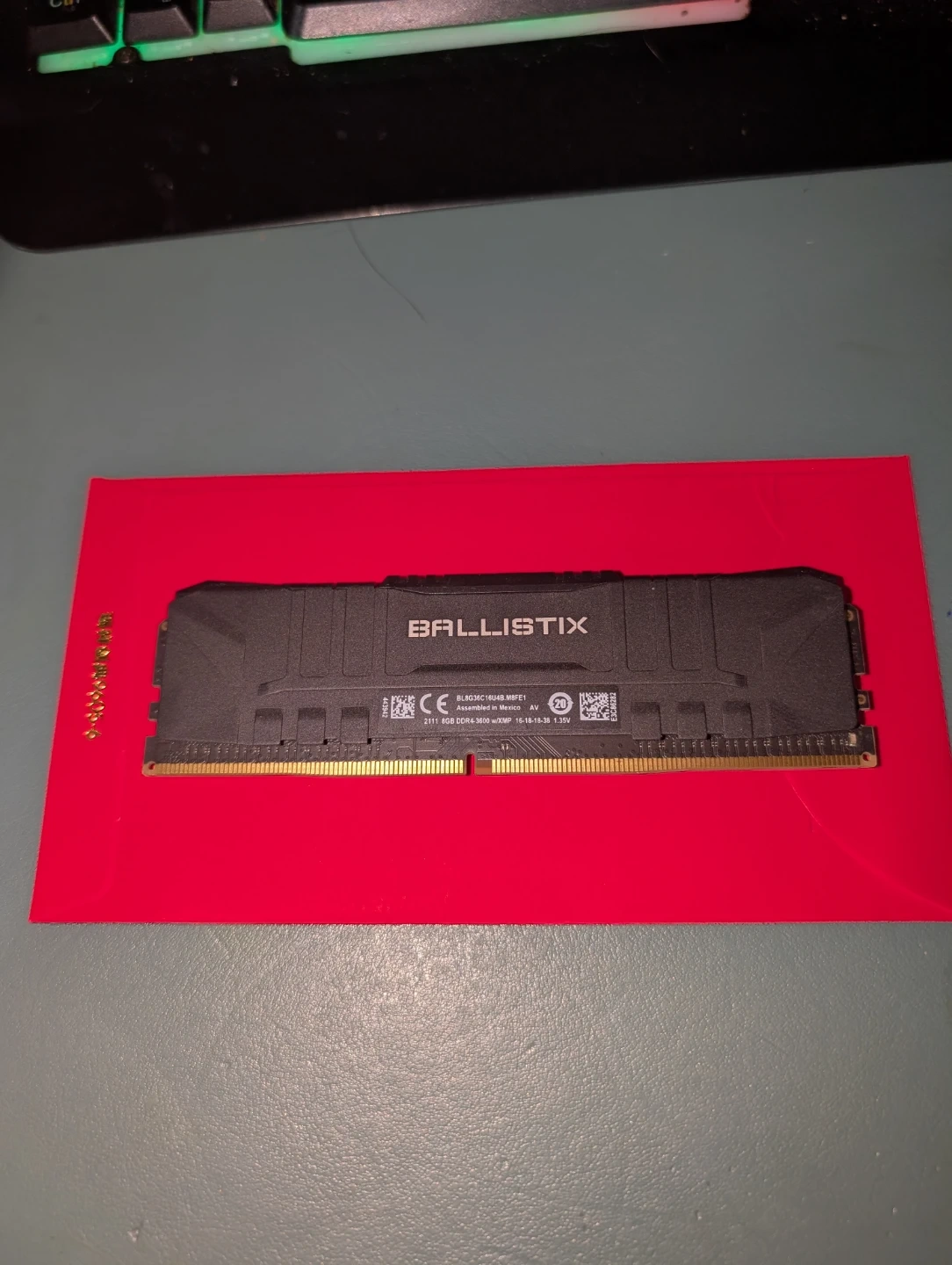 This is a Ballistix 8GB DDR4 RAM stick. It's rated for 3600MHz with XMP timings of 16-18-18-38 at 1.35V. Assembled in Mexico.