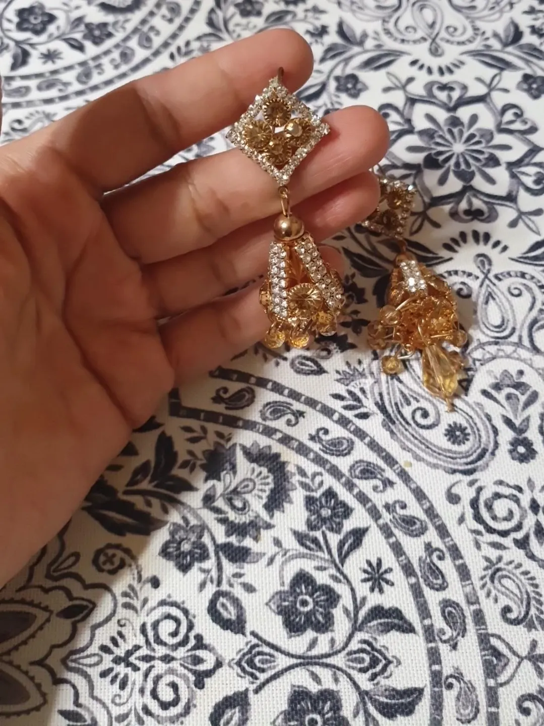 Buy & SellGold Jhumka Earrings with CrystalsGold Jhumka Earrings with Crystals$17These are pretty gold-toned jhumka earrings. They feature a diamond-shaped top with a dangling bell-shaped base, adorned with clear crystals. ConditionNewWHERE TO MEETCheck LocationView MapSELLERverifiedNaveelaCity Center711 review0 chats·0 favorites·11 viewsSEND CHAT TO SELLERHi Naveela! I’m interested in your listing.Hi Naveela! I’m interested in your listing.Get the Karrot app to chatSign In to chat