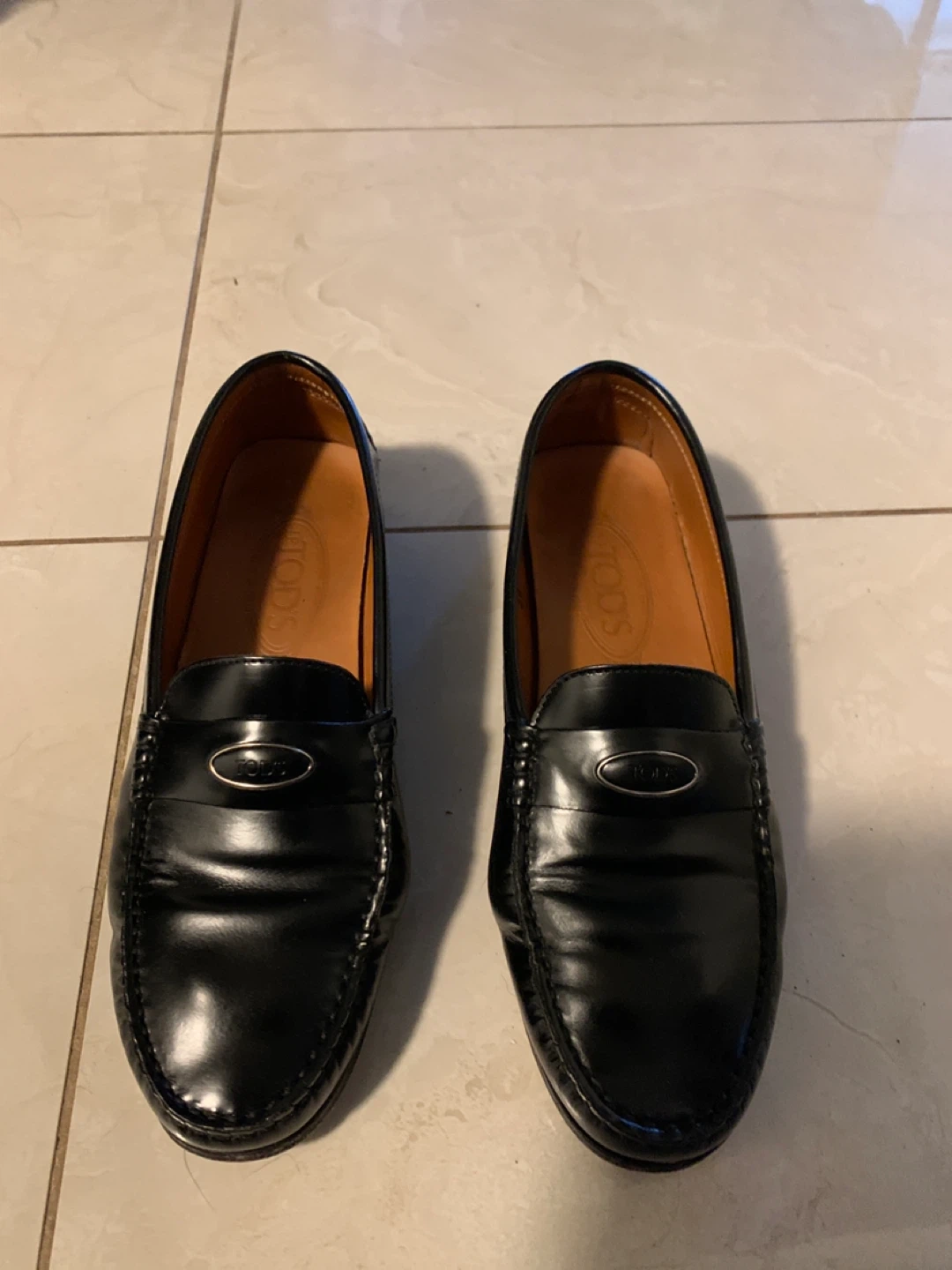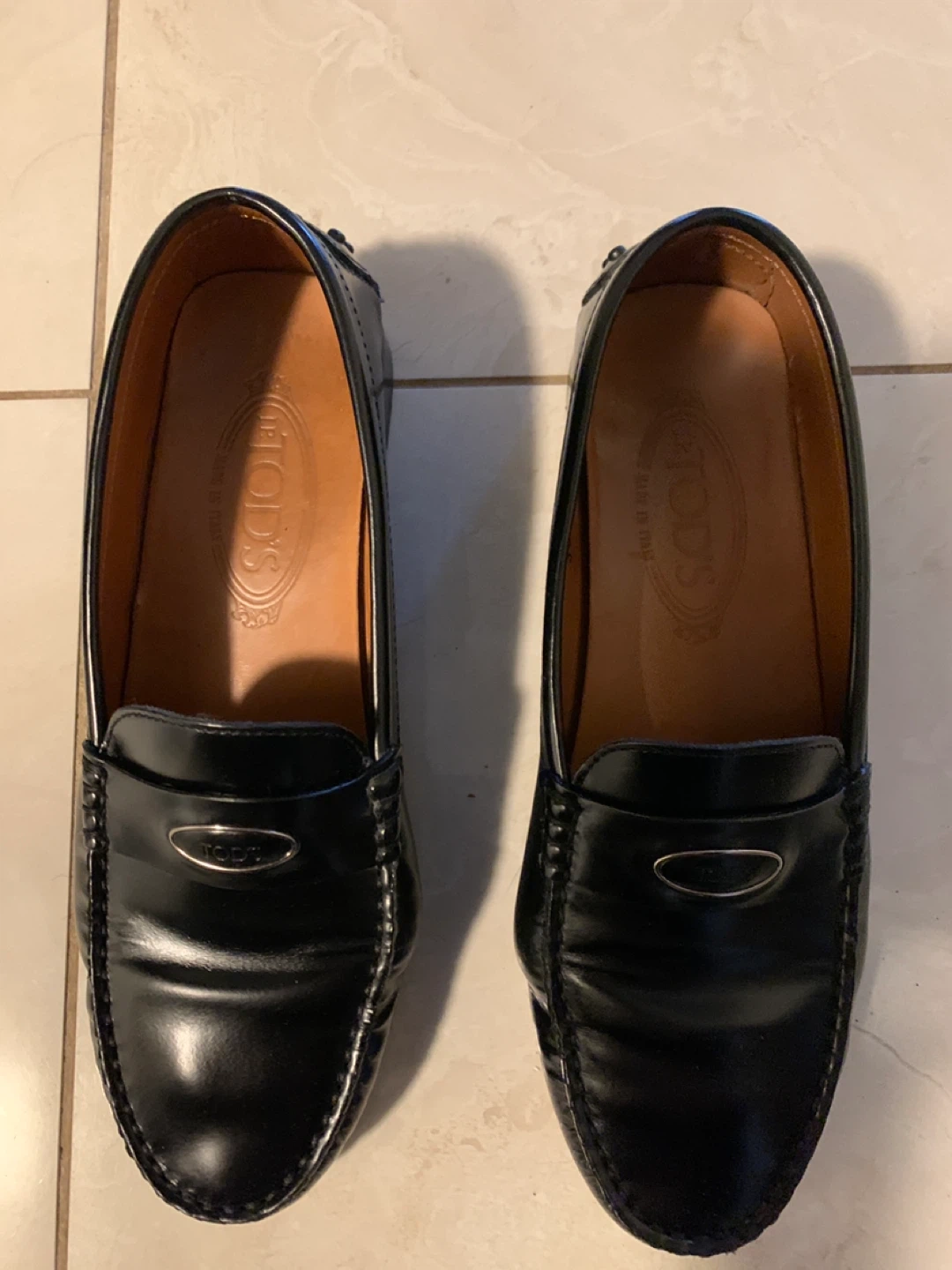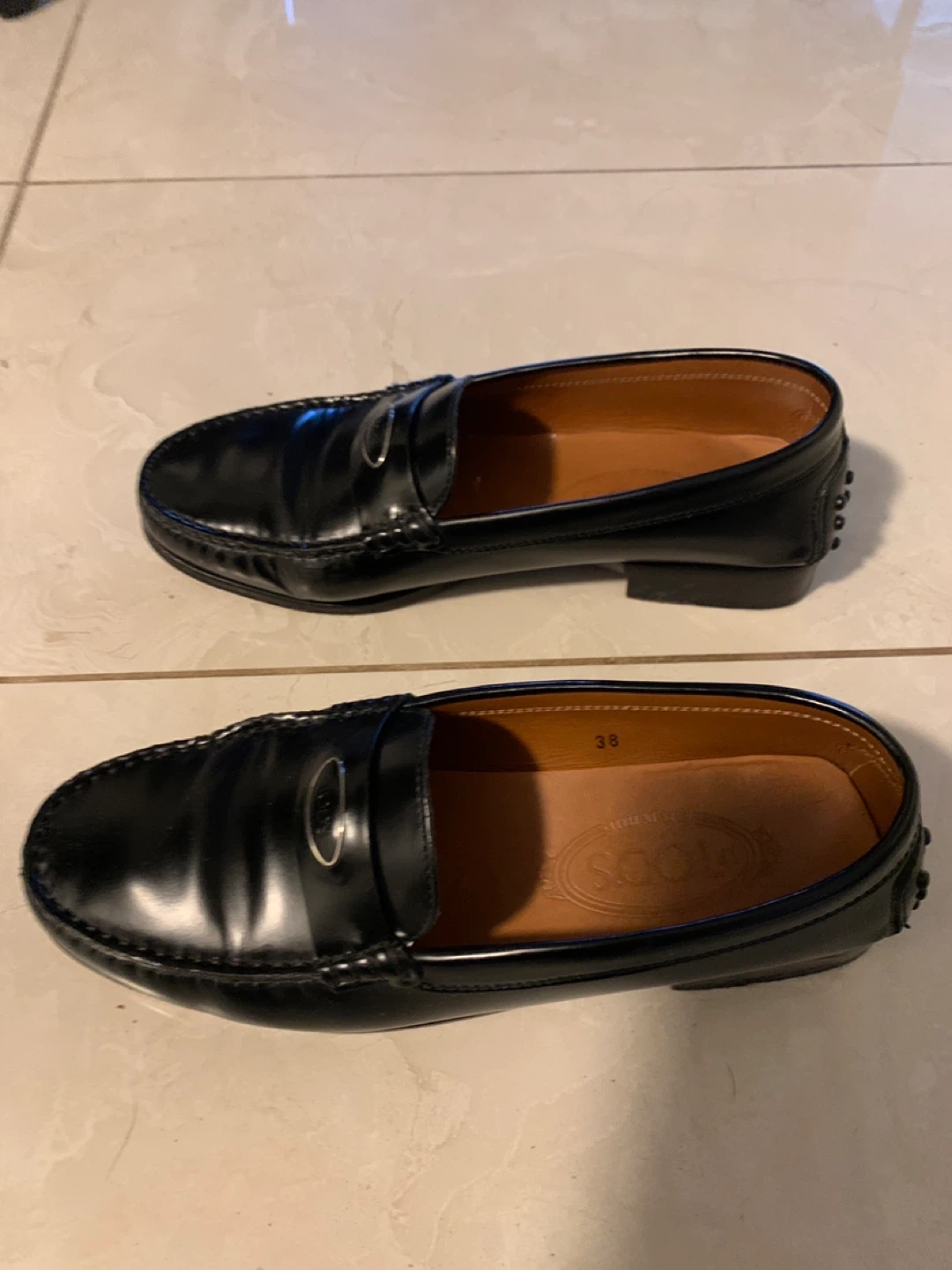 Classic TOD'S black leather driving shoes. These Gommino loafers feature the iconic rubber pebble sole and a polished metal accent. Size is 38.