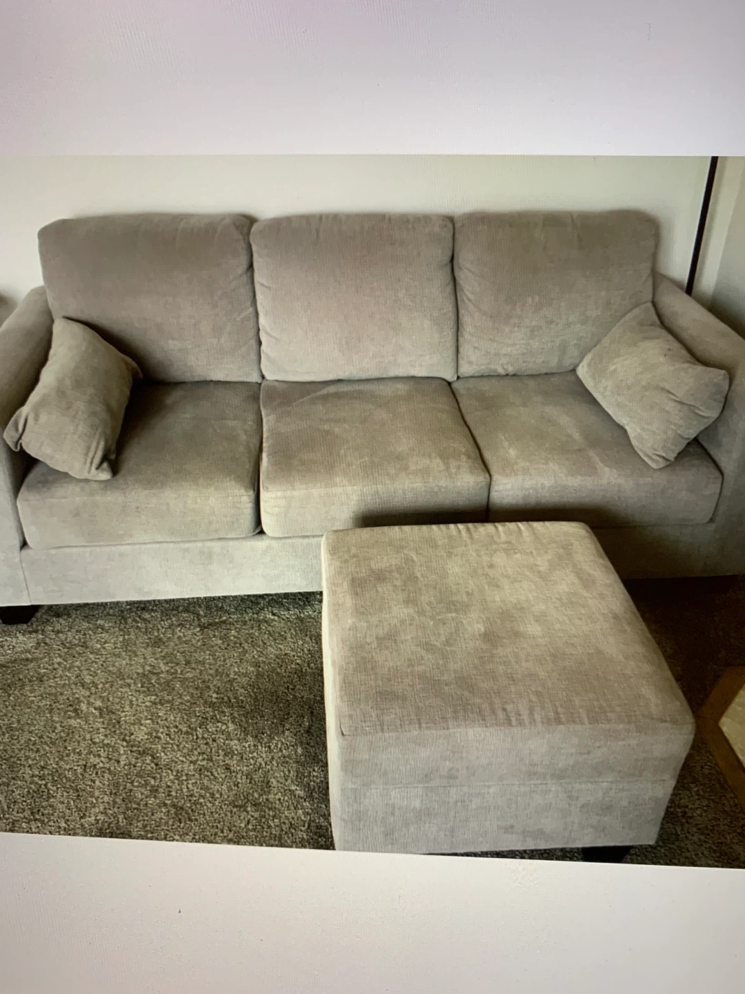 This comfortable sofa is upholstered in a soft fabric, offering ample seating space. It includes a matching ottoman that can be used as a footrest or extra seating. The ribbed texture on the fabric adds a subtle detail. Couch is 77” long x 3 ft wide. Ottoman is