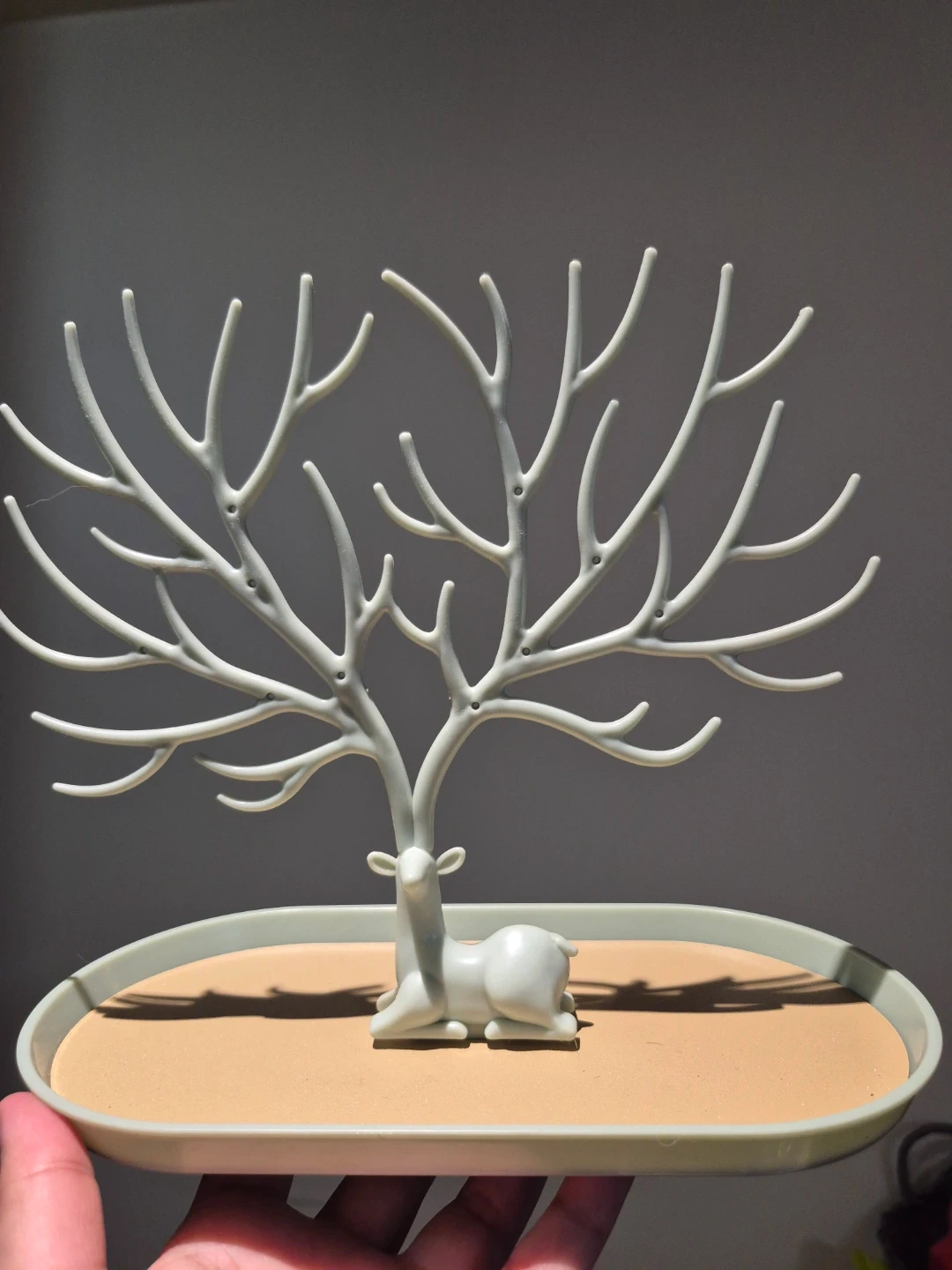 This cute jewelry tree organizer features a white deer at the base. Its branches are perfect for hanging necklaces, bracelets, and earrings. It sits on a light brown tray for smaller items like rings. Great for keeping your accessories tidy!