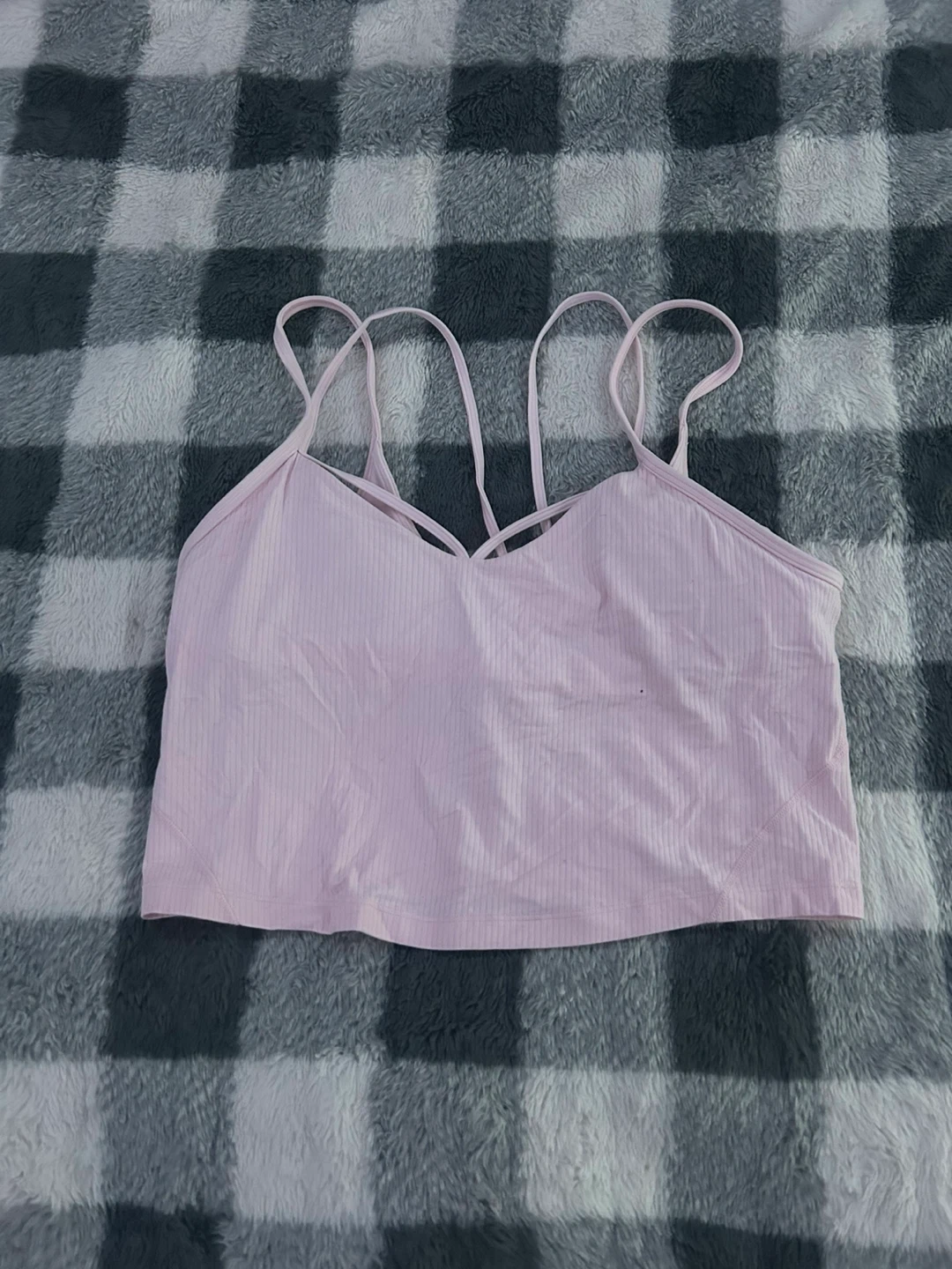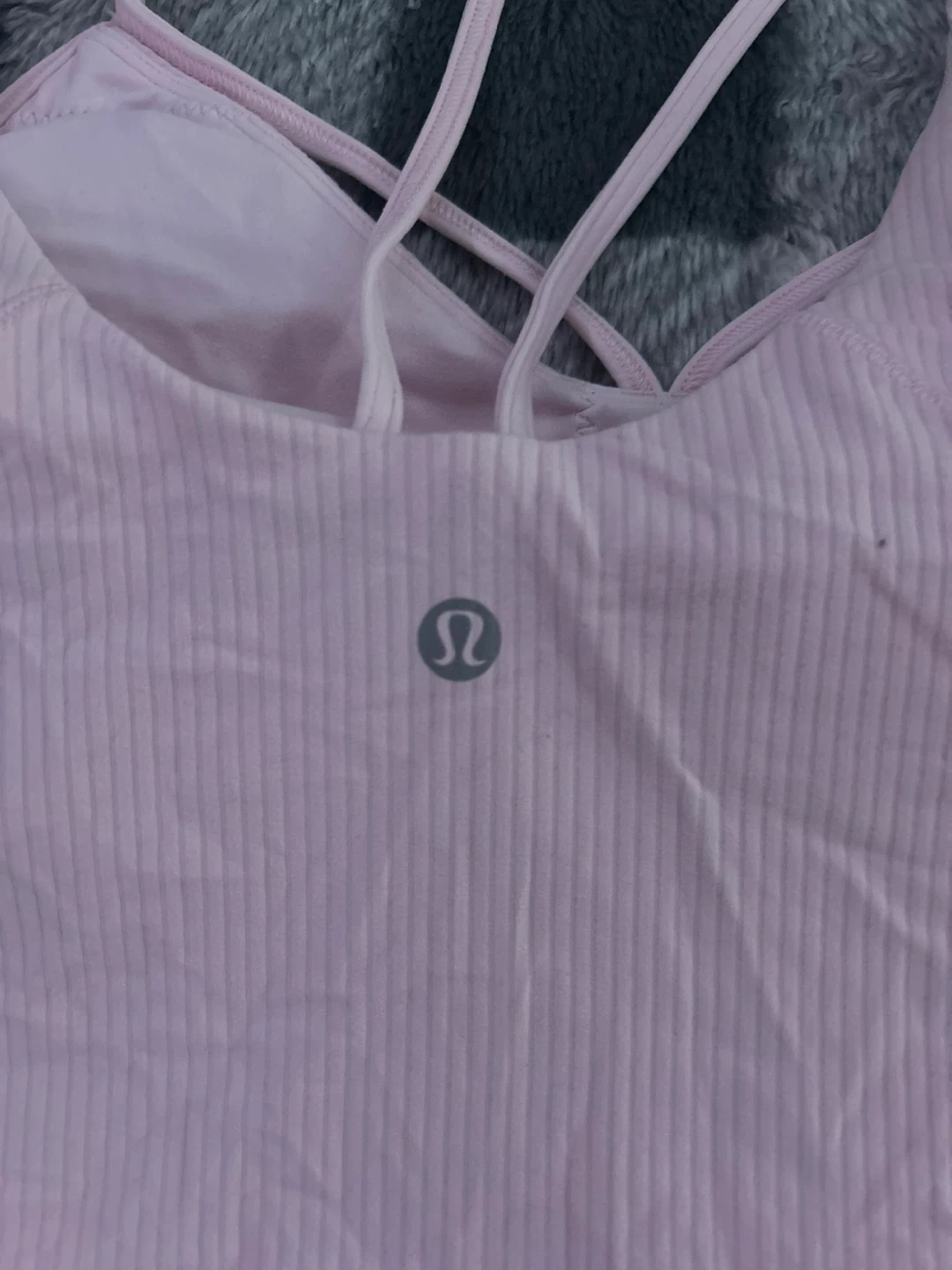 This Lululemon cropped tank top is pink and ribbed. It has a strappy back design. It's made for comfort during workouts or everyday wear.