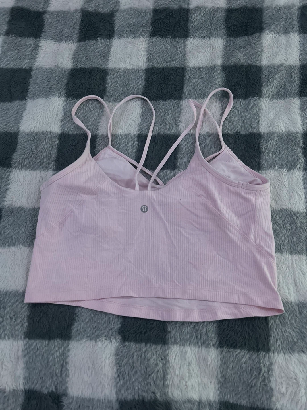 This Lululemon cropped tank top is pink and ribbed. It has a strappy back design. It's made for comfort during workouts or everyday wear.