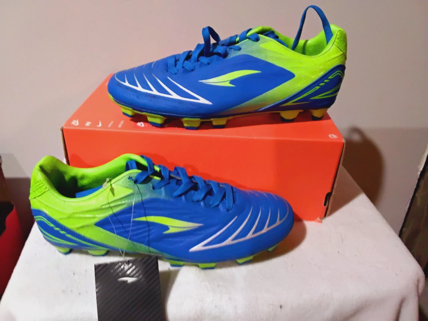 These are Puma soccer cleats in a vibrant blue and neon green colorway. They feature a durable synthetic upper and a multi-studded outsole for optimal traction on the field. These cleats are designed for play on firm ground surfaces. Size:5.5